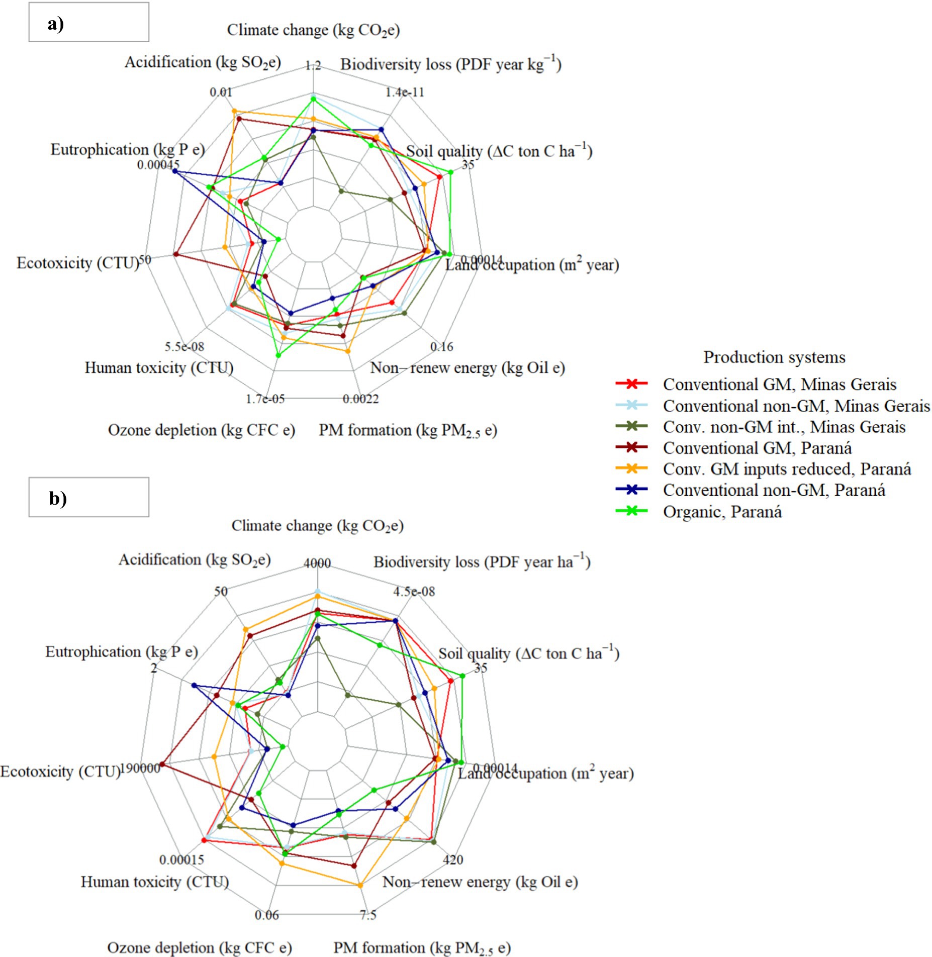 The objective of this study was to assess the environmental footprints of conventional and alternative soybean production systems in Paraná and Minas Gerais, Brazil. Given the various soybean cultivation pathways in Brazil, and for a comprehensive assessment, we identified the following impact categories as essential to investigate for their relevance in crop production systems: climate change, acidification potential, eutrophication potential, ecotoxicity potential, human toxicity potential, ozone depletion, particulate matter formation, non-renewable energy use, land use, biodiversity loss impact, and soil quality (Bartl et al., 2012; Naudin et al., 2014; Legaz et al., 2017; Matsuura et al., 2017; Nemecek et al., 2019; De Laurentiis et al., 2024; Lucas et al., 2025). In addition to LCA, we also assessed the extent of on-farm agrobiodiversity (FAO, 2019). Thus, this study provides a robust empirical foundation and a broader perspective on the sustainability of soybean production systems, facilitating informed decision-making in the design of environmentally sustainable food systems.