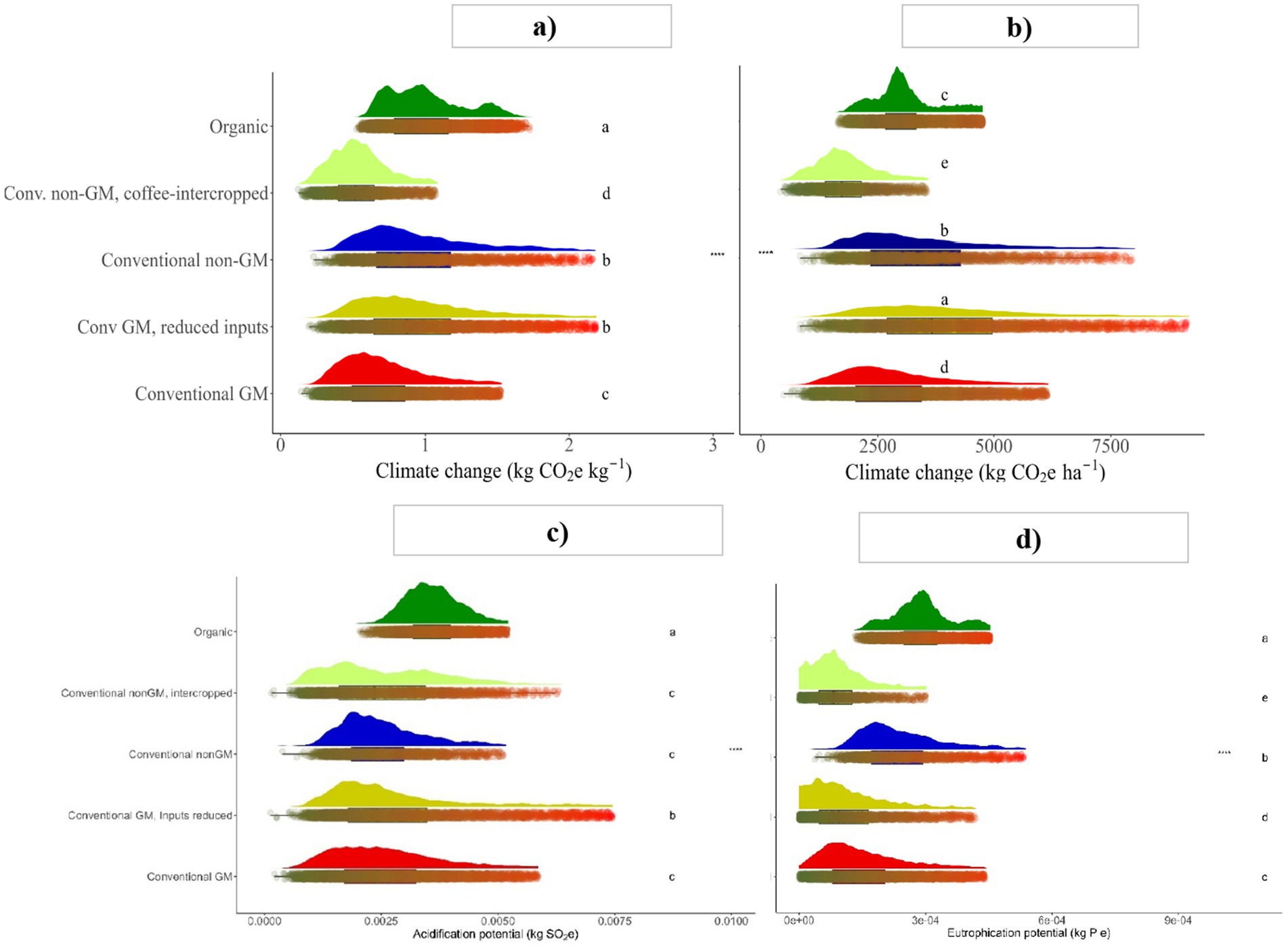 Uncertainty distributions enhanced the understanding and interpretation of the discrete scores. They also allowed us to compare the systems statistically. Figure 4 presents the uncertainty distributions of climate change impacts of soybean production per kg and per hectare. For instance, the climate change impact was significantly different between systems (p < 0.001), with organic soybean scoring highest due to the relatively high use of machinery, while intercropped soybean scored lowest. However, the propagation overlap between systems is also high. The uncertainty propagation results of all the impact categories are presented in the Supplementary Information, section 5.