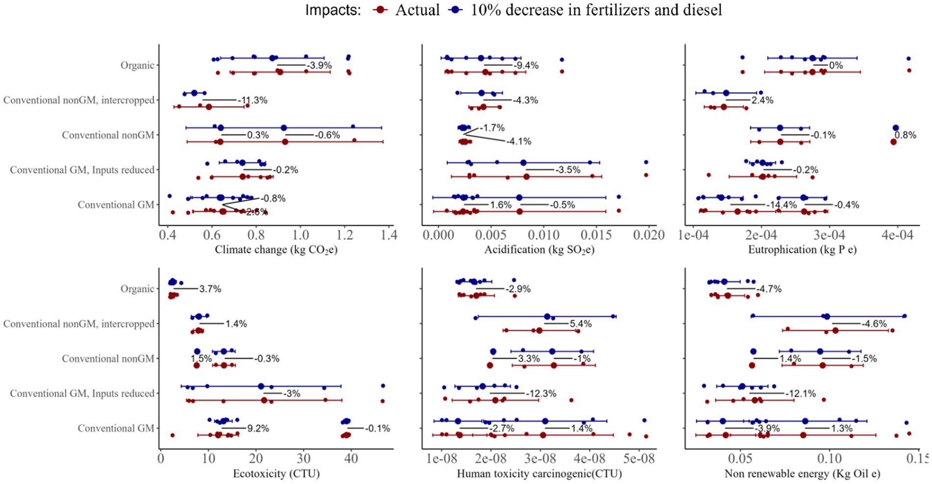 Our sensitivity analysis indicated that a 10% reduction in fertilizers and diesel could decrease emissions by 0 to 14.4% across production systems, with most impact categories exhibiting reductions below 10%. Climate change impacts were reduced by only up to 2.6% in conventional production, by 3.9% in organic, but by 11.3% in intercropped soybean. The lowest change in acidification was in conventional soybean production, with 0.5%, while acidification in organic could be reduced by 9.5%. Figure 5 presents the sensitivity results of all the resulting emissions to changes in the inputs. The sensitivity analysis suggests that a mere reduction of fertilizers and diesel has a limited impact on footprints reduction. Therefore, better environmental performance can be obtained through the reduction of inputs by implementing and leveraging intercropping systems. However, efforts in transitioning to less input-intensive systems often came with major challenges in limited knowledge, inadequate technical support, and the need for bioinputs production on-farm.