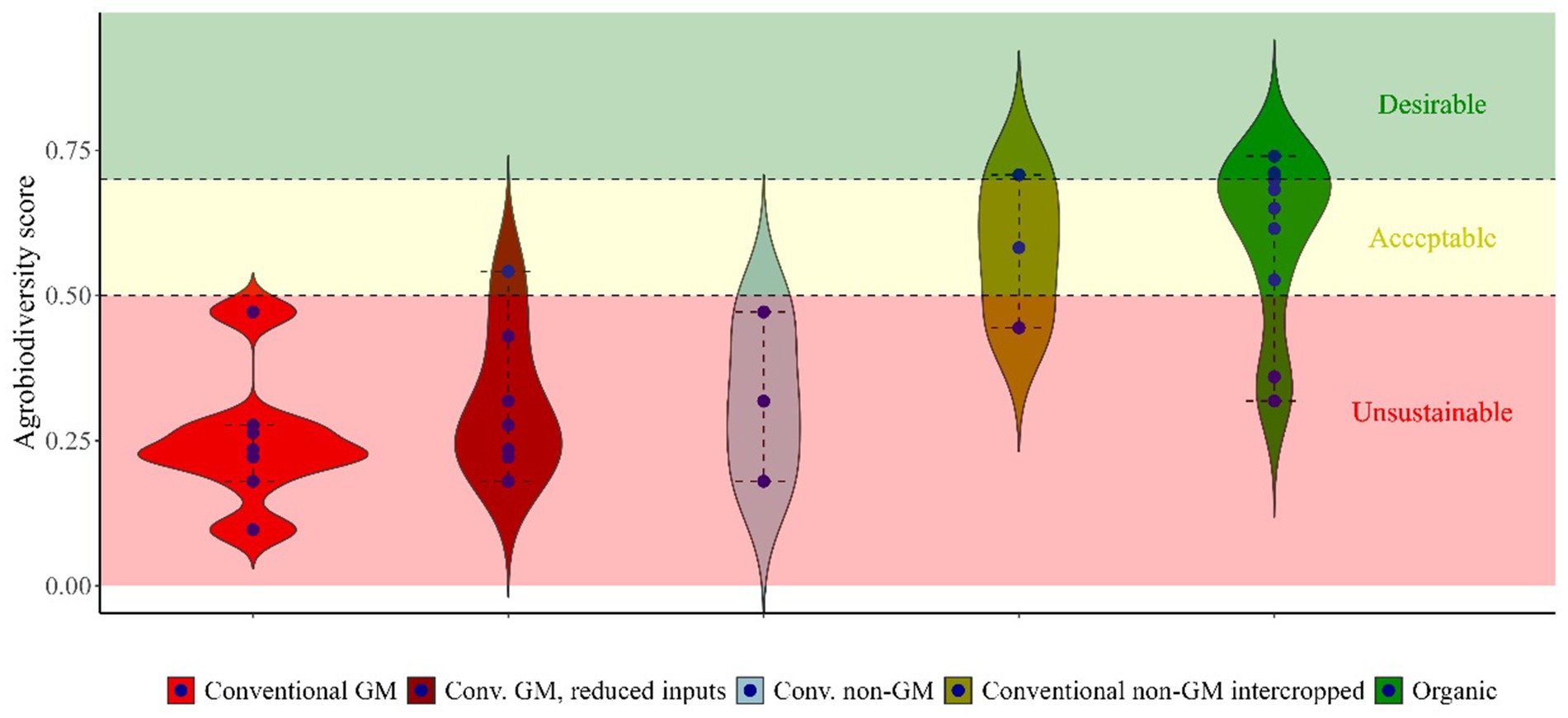 From this agroecological indicator, the contrast between productivity and sustainability is depicted, with conventional systems having less biodiversity of living organisms on farms.