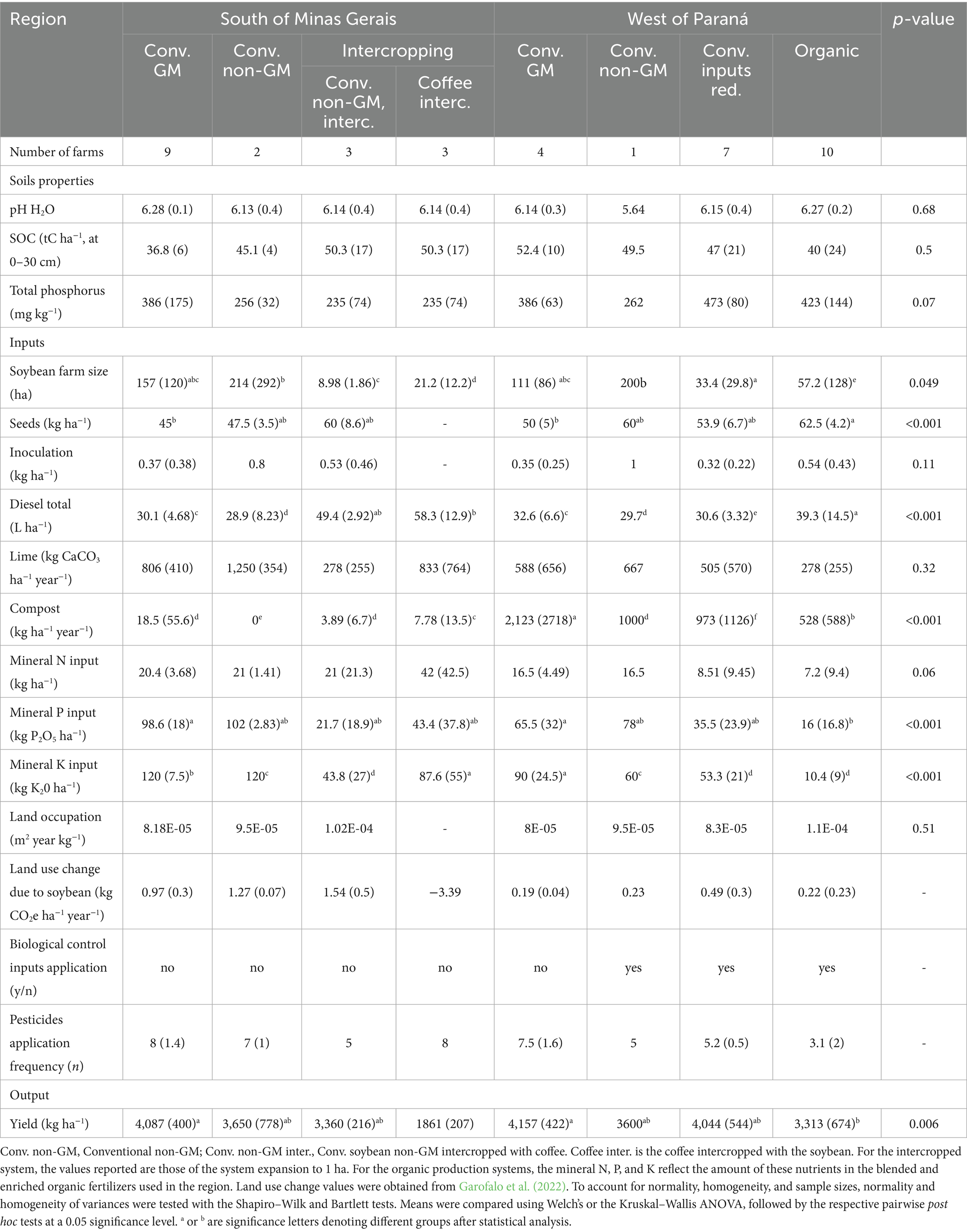The inventoried results of different production systems in terms of soil properties, main inputs, and outputs are presented in Table 1. Values are annualized and represent the average of the two crop years investigated. Values in brackets are standard deviations. The nutrients N, P, and K inputs from fertilizers were calculated from their elemental concentrations in the specific mineral and organic fertilizers inventoried.