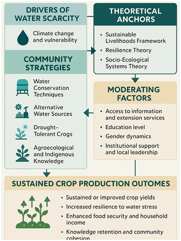 This study responds to this gap by documenting household-level strategies for sustaining crop production under water scarcity in semi-arid South Africa. Using a mixed-methods approach, the study develops an integrated socio-ecological conceptual framework that draws on the Sustainable Livelihoods Framework (DFID, 1999), Resilience Theory (Folke et al., 2002), and Socio-Ecological Systems (SES) thinking (Ostrom, 2009). By explicitly linking empirical evidence with theoretical perspectives, the framework highlights the dynamic interplay between environmental stressors, community responses, and institutional enablers. In doing so, it provides a grounded basis for assessing agricultural resilience and guiding targeted interventions aimed at sustainable food production under climate stress.