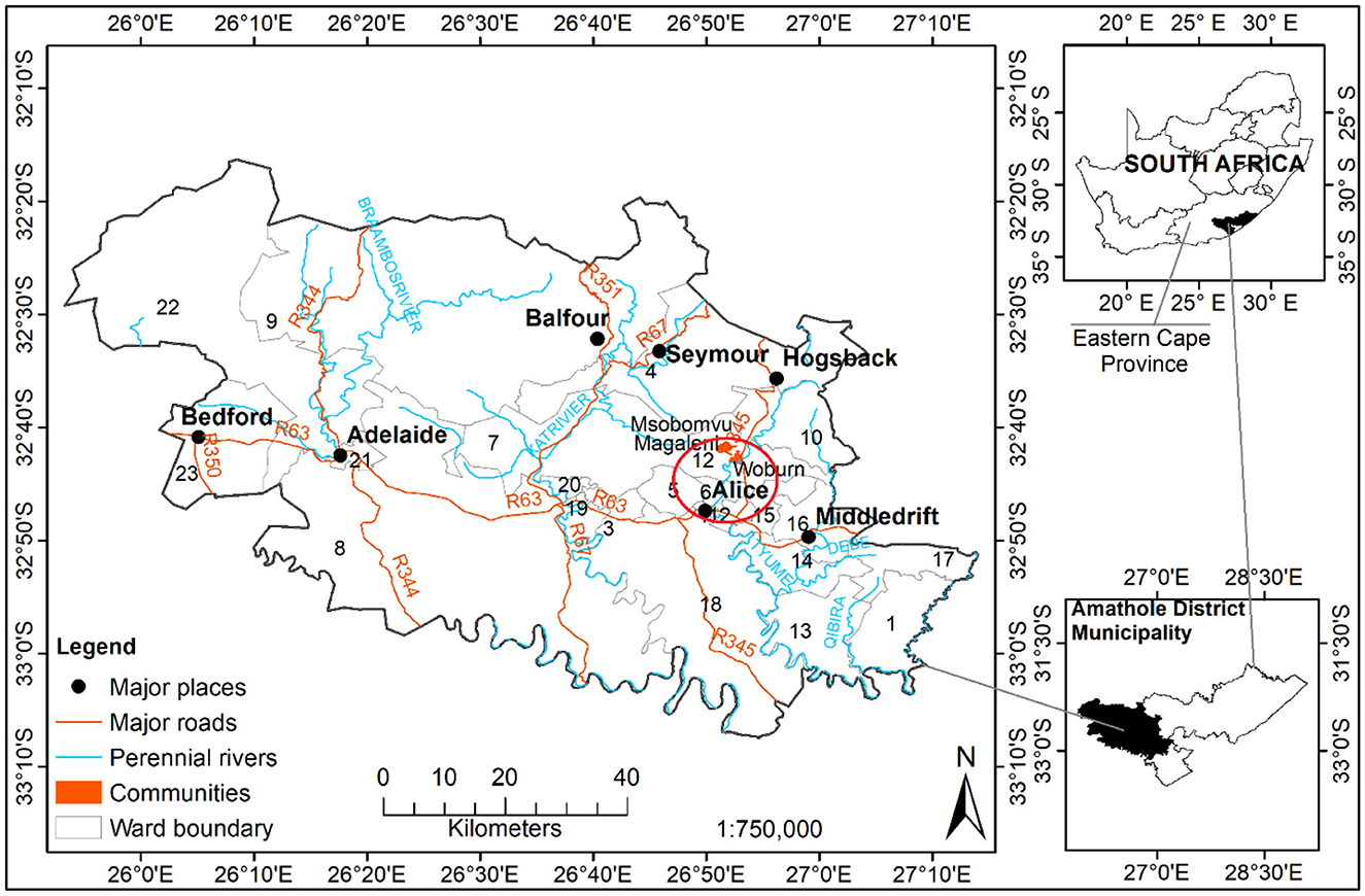 The study was conducted in the Raymond Mhlaba Local Municipality (RMLM), located in the Eastern Cape Province of South Africa (Figure 2). The Eastern Cape is the country's second-largest province, covering approximately 169,000 km2, 13.9% of South Africa's total land area. It lies between KwaZulu-Natal and the Western Cape, with the Indian Ocean forming its southern and eastern boundary. The province includes two metropolitan municipalities (Nelson Mandela Bay and Buffalo City), six district municipalities, and 37 local municipalities. Raymond Mhlaba forms part of the Amathole District Municipality and is situated at approximately 32.2968° S and 26.4194° E. The municipality is predominantly rural, with small towns such as Fort Beaufort, Alice, and Middledrift, which serve as administrative and service hubs.