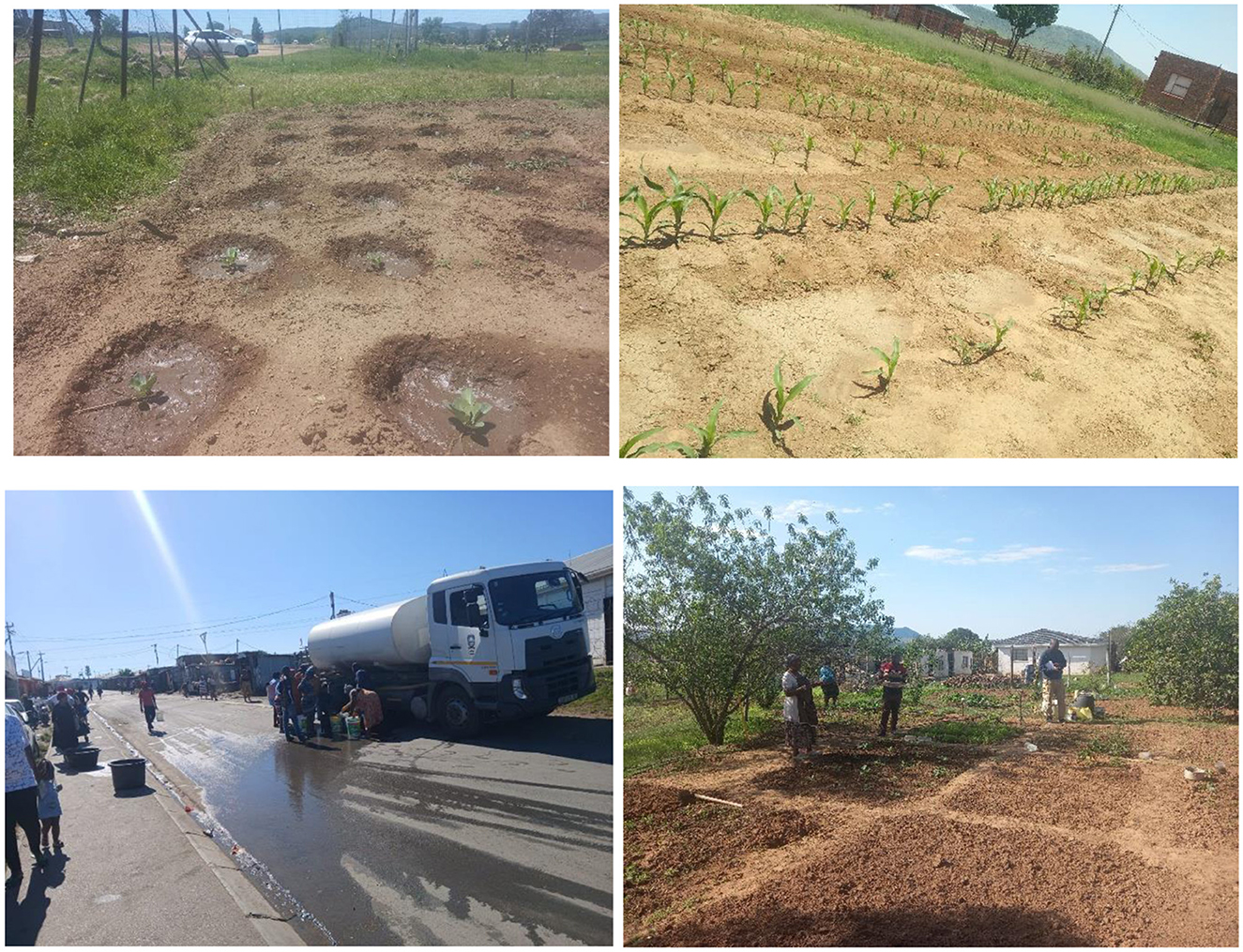 Figure 3. Photographs depicting home gardens and community water collection points in Msobomvu village.