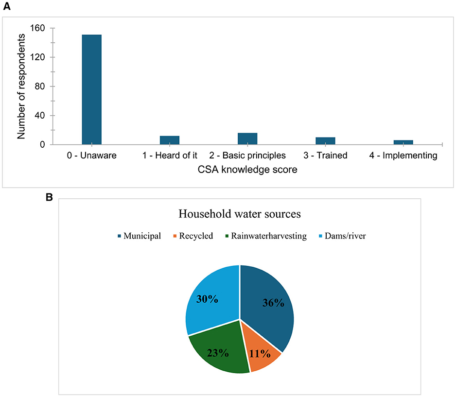 Figure 4. (A) CSA knowledge score and (B) water sources for garden irrigation in the Raymond Mhlaba local municipality.