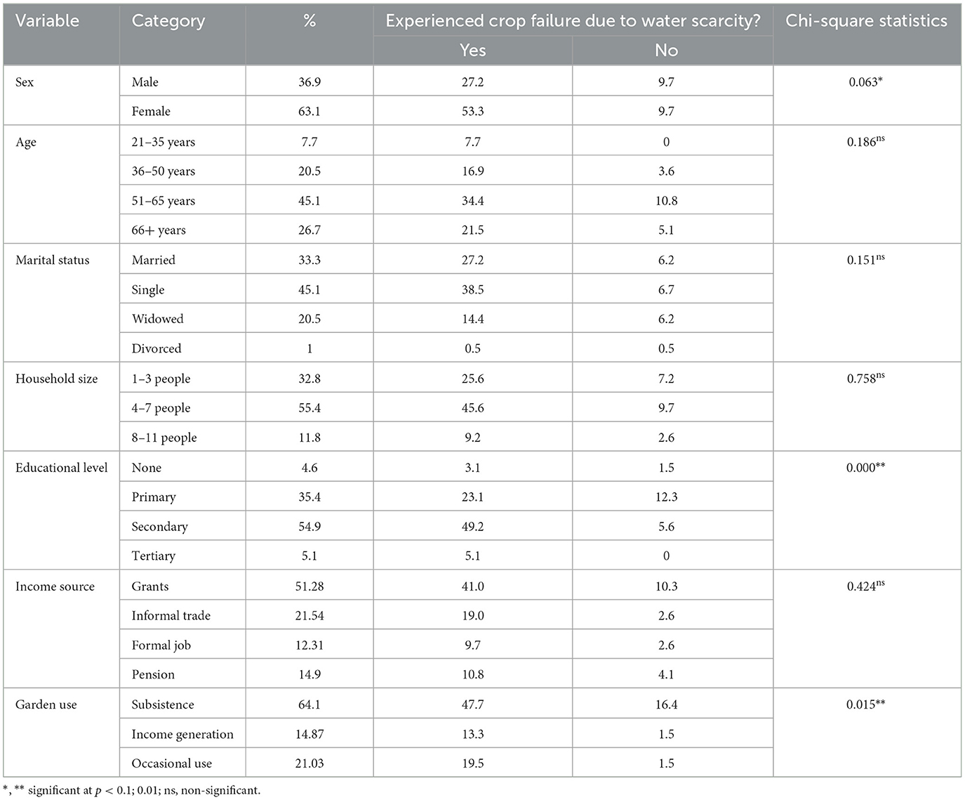 Table 1 summarizes the characteristics of the 192 surveyed households. A majority were female-headed (63.1%). Crop failure due to water scarcity was more frequently reported by female-headed households (53.3%) than male-headed households (27.2%), with this association bordering on statistical significance (χ2 = 0.063, p < 0.1). Respondents were predominantly older: 45.1% were aged 51–65, and 26.7% were 66 and above. Only 7.7% were aged 21–35, raising concerns about an aging farming population. However, no significant association was found between age and crop failure (p > 0.05). Education showed a strong association: households with higher education levels were less likely to experience crop failure (χ2 = 0.000, p < 0.01). Garden use was also important, subsistence gardens (64.1% of households) were more vulnerable to water stress than gardens used for income generation or occasional use (χ2 = 0.015, p < 0.05). Other variables (marital status, household size, and income source) were not significantly associated with crop failure, though descriptive patterns suggest slightly higher crop loss among single and widowed households.