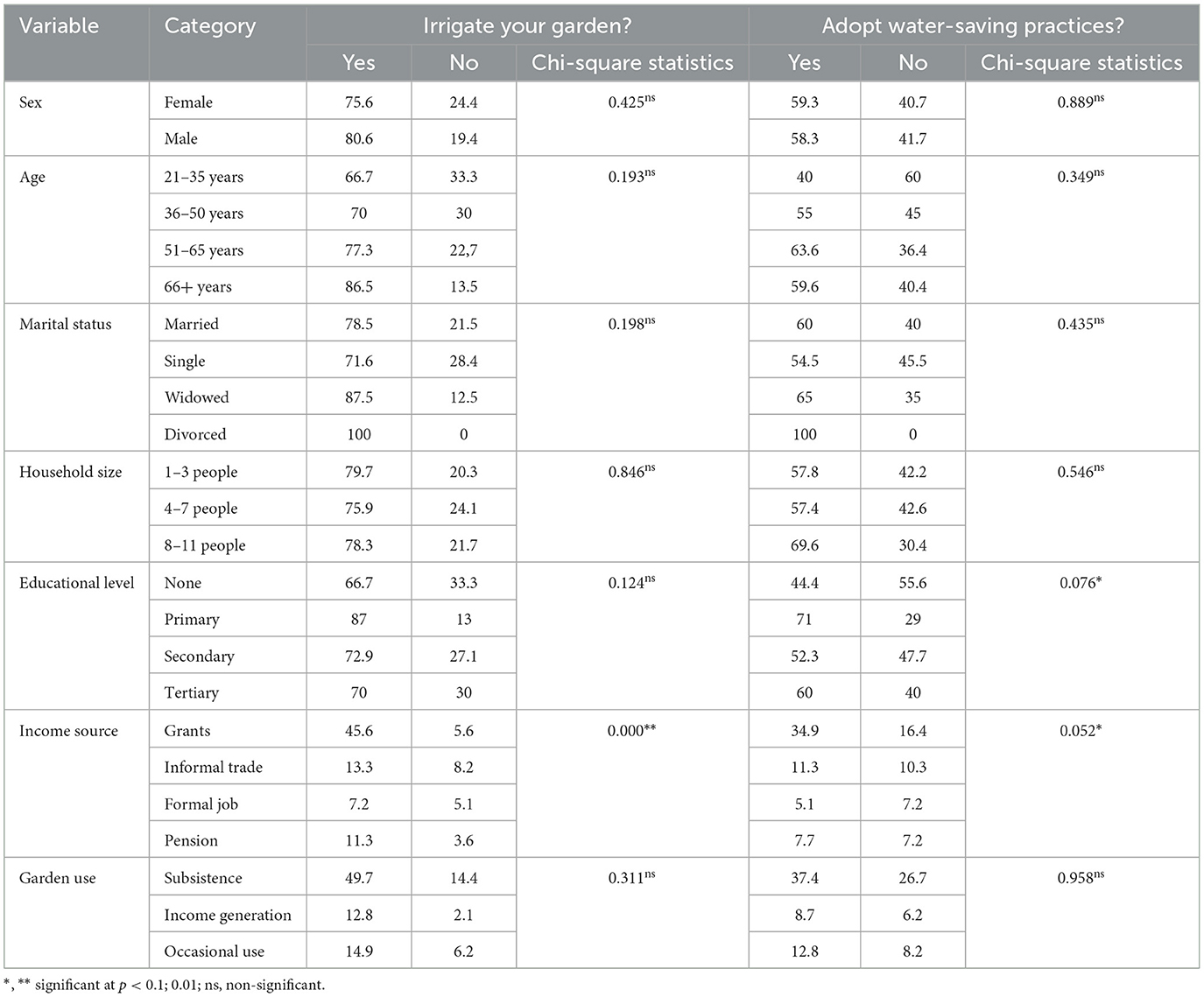 Education level, while not statistically significant for irrigation application (p = 0.124), showed interesting trends. Respondents with primary education were most likely to irrigate (87%), followed by those with secondary (72.9%) and tertiary education (70%). Those with no formal education had the lowest irrigation rates (66.7%). Regarding the adoption of water-saving practices, there was no significant gender difference (females: 59.3%; males: 58.3%, p = 0.889). Older respondents, especially those aged 51–65 years, had the highest adoption rate (63.6%), while those aged 21–35 had the lowest (40%). Again, these differences were not statistically significant. Although not statistically significant, larger households (8–11 members) were more likely to adopt water-saving practices (69.6%), possibly reflecting greater awareness or need due to higher domestic water demand (Figure 3). Respondents with primary education again had the highest adoption of water-saving techniques (71%), compared to 44.4% among those with no education. This difference approached significance (χ2 = 0.076, p < 0.1), suggesting education may influence sustainable water management behavior. Income source showed statistically significant differences in both irrigation (χ2 = 0.000, p < 0.01) and water-saving practices (χ2 = 0.052, p < 0.1). Households relying on social grants were more likely to irrigate (45.6%) and adopt water-saving strategies (34.9%), followed by those engaged in informal trade and pension-based incomes. No significant association was observed between garden use purpose (subsistence, income generation, or occasional use) and either irrigation or water-saving behavior (p > 0.05), though subsistence users accounted for most irrigation and conservation adoption.