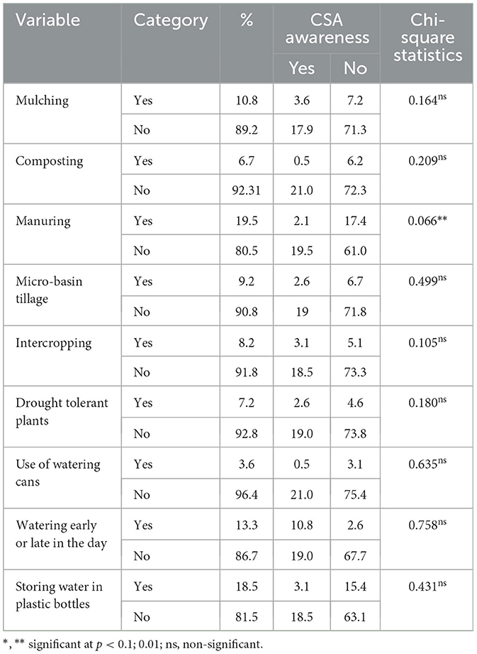 The association between household-level adaptation strategies and CSA awareness in Raymond Mhlaba Local Municipality reveals that (Table 3), among the strategies assessed, only the use of manuring exhibited a statistically significant relationship with CSA awareness (χ2 = 0.066; p < 0.1). Notably, a higher proportion of households unaware of CSA practices engaged in manuring (17.4%) compared to those with CSA awareness (2.1%), suggesting that this traditional practice may be more prevalent among households with limited exposure to CSA principles. Other strategies, including mulching, composting, intercropping, the use of drought-tolerant plants, and water conservation techniques, showed no significant association with CSA awareness.