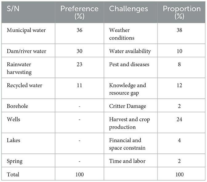 One of the benefits of rainwater harvesting (23%), as mentioned by respondents in this study, is that it provides communities with the opportunity to save water, particularly in regions facing water scarcity. This practice promotes self-sufficiency and reduces dependence on municipal water systems, which can be unreliable. The community members' preferences also showed a lower inclination toward recycled water (11%), possibly due to concerns about water quality and safety. Despite treatment processes, some gardeners may worry about potential contamination, while others may lack knowledge and awareness about water recycling. Other sources, such as boreholes and wells, were not utilized in the study, possibly due to the costs of installation. These water preferences indicate a complex relationship among reliability, accessibility, cost, and environmental considerations. Municipal water was the primary source, likely due to its recognized reliability and safety, while there is a strong interest in sustainable practices such as rainwater harvesting.