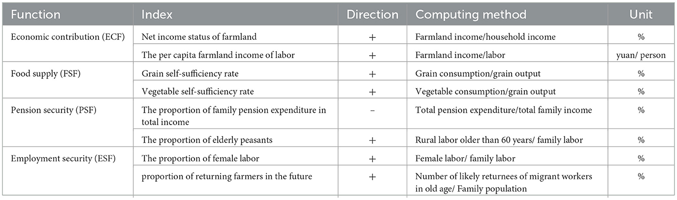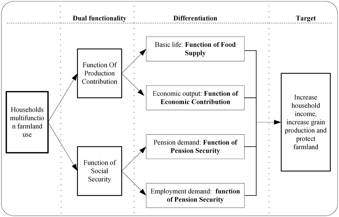 As shown in Figure 2, first, the food supply function is the basic function of MFU, which is a broad consensus by relevant research (Jiang et al., 2020; Allan et al., 2015; Gómez-Limón et al., 2012). Second, farmland cooperates with other production factors, such as labor and capital, to provide the ECF (Maniruzzaman et al., 2024). Third, in the process of rapid urbanization and industrialization, the aging of the agricultural labor force is a common feature in rural areas, and their livelihoods are highly dependent on farmland use; the PSF of farmland use is gradually strengthened (Guo and Wang, 2024). Fourth, on the one hand, the ability of the female labor force to work in the non-agricultural sector is relatively low; the rural left behind female labor force has employment demand for farmland use (Dabara and Chiwuzie, 2022); on the other hand, the possibility of male labor force returning to their hometown to work in agriculture when they are getting old (Liu et al., 2022) Retaining farmland resources for their own or future generations' use, meeting basic employment, and avoiding social risks is a long-term tradition of rural households. Therefore, the ESF of farmland use is becoming increasingly prominent.