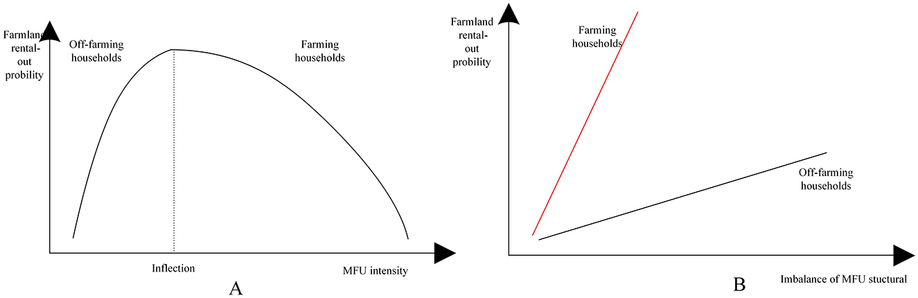 The rental of rural surplus labor to non-agricultural sectors has brought about tremendous changes in the livelihoods of rural households compared with traditional approaches, e.g., from “living on agriculture” to “part-time production” (Kuang et al., 2020). The coexistence of agriculture and non-agriculture is a common feature in rural areas. Limited by labor force, ideology, and other reasons, the probability of some households (farming households) opting for non-agricultural employment is relatively low, resulting in a lower total household income and a greater reliance on land use and agricultural production for their livelihoods. Thus, when aiming to maximize survival, they are more inclined to reserve farmland for agricultural production. For other households (off-farming households), the marginal income of the non-agricultural sector is far larger than that of the agricultural sector. The opportunity cost of farmland renting-out is almost zero. Off-farming households tend to choose to withdraw from farming land and are more inclined to renting-out their farmland to maximize benefits. This differentiation caused by the intensity of MFU leads to an inverted U-shaped relationship between MFU and farmland renting-out (Figure 3A).
