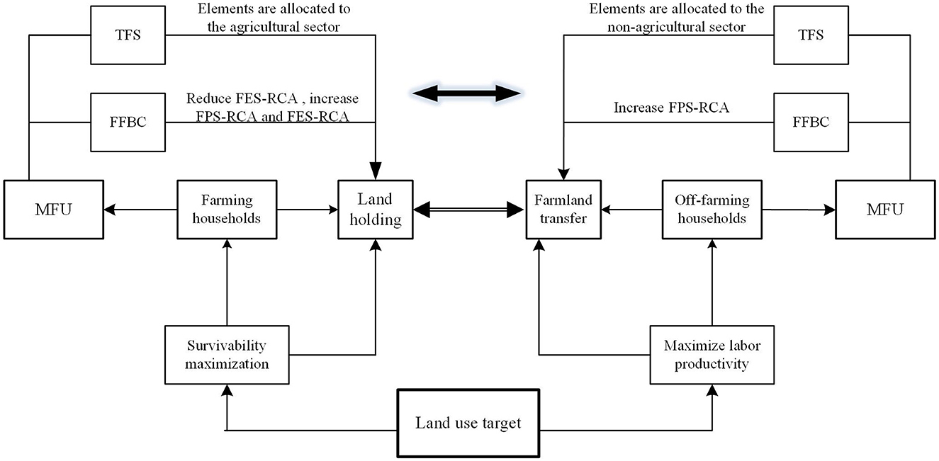 The key point of the research on farmland renting-out is to analyze the restrictive factors and their impact mechanism. To date, most studies on the impact mechanism of households' farmland renting-out have been conducted from the perspectives of property rights stability, financial awareness, transaction costs, and so on (Kong et al., 2018; Tan et al., 2022; Kan, 2021). In turn, there are relatively few studies on the comprehensive analysis of the impact of MFU on farmland renting-out, mainly focusing on the single function use and average impact on farmland renting-out (Kung, 2002; Feng et al., 2010; Huang et al., 2023; Xu et al., 2018; Su et al., 2018; Deng et al., 2018; Zhou et al., 2020).