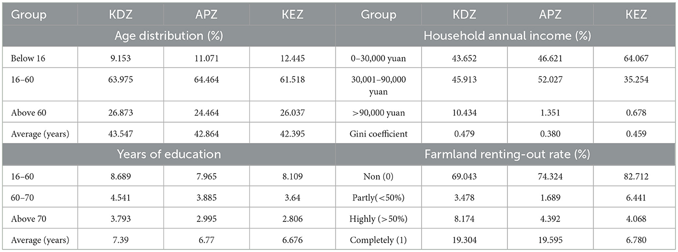 Table 1 reports the basic characteristics of the sampled rural households. (1) The average age of household members in the study area is about 43.547 years old. The household labor in the survey area is relatively sufficient, with more than 60% of the population aged 16–60 years. However, the aging situation is evident, with the proportion of the elderly exceeding 24%. (2) The education level of the household members is low (7.39 years), and they generally only complete the primary education stage (3). The household income in the study area varies significantly. The household income of KDZ is relatively high, with 10.42% annual household income over 90,000 yuan, while the Gini coefficient is the largest (0.479); the household income level in APZ is low, while the Gini coefficient is relatively low (0.380); the household income level in KEZ is the lowest, with 64.07% household annual income below 30,000 yuan.
