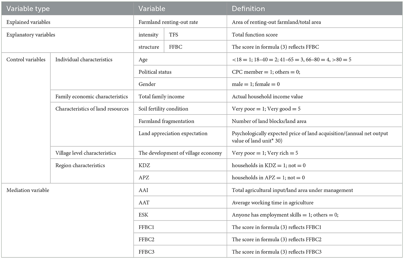 • Mediator variable of TFS. We selected production factor indicators (Excluding land factors, because farmland renting-out reflects the allocation of land factor) as the mediator variables of TFS. The variables of Average Agricultural Input per mu (AAI) reflect the capital factor; the variables of Average Agricultural working Time of households (AAT) reflect the labor factor; the variables of whether the households have Employment Skills (ESK) reflect technical factors.