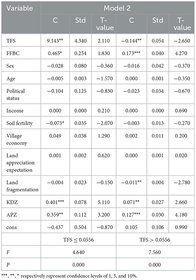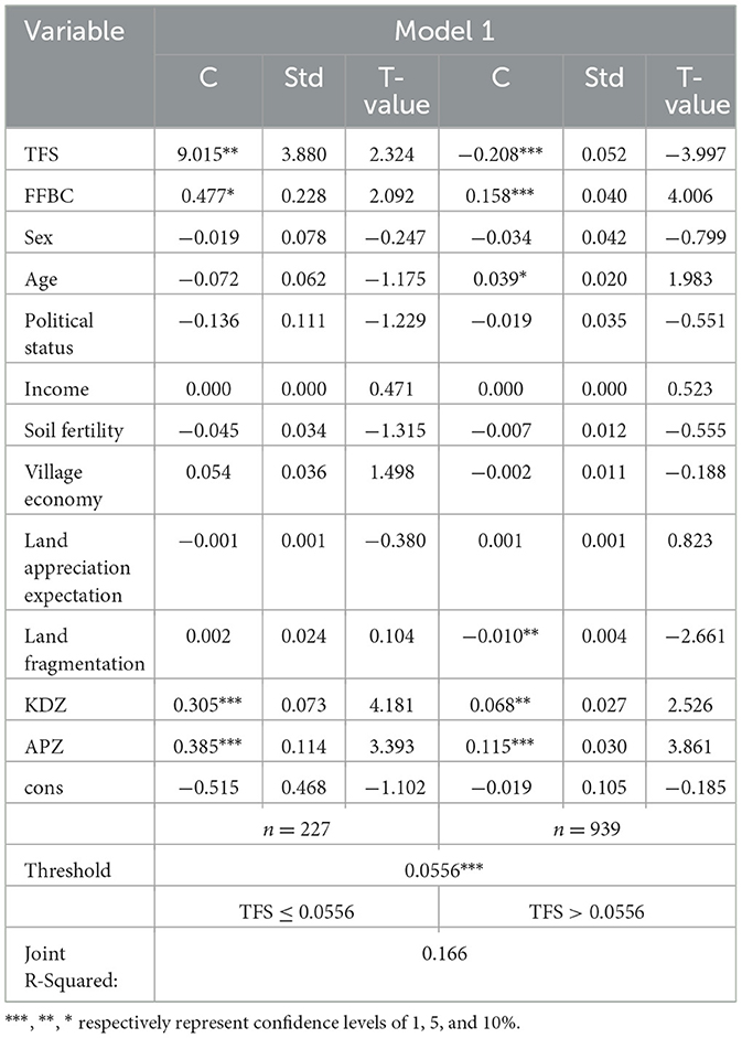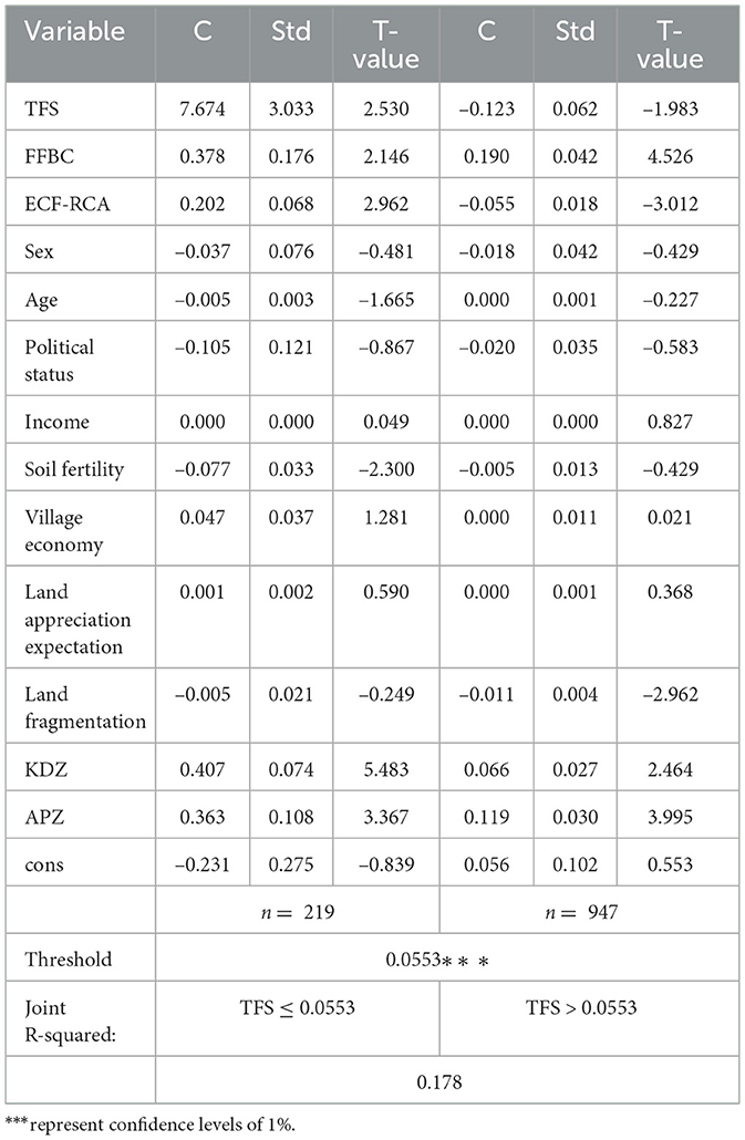 First, we tested the impacts of MFU intensity on the farmland renting-out in Model 1 using the cross-sectional data threshold effect model. Table 4 shows that the original hypothesis is rejected at the 1% significance level when the variable TFS is taken as the threshold variable, indicating that the intensity of MFU exhibits threshold-driven bifurcation in renting-out decisions, and the threshold value is 0.056. Given the considerable importance of ECF in rural household farmland use (mean value = 0.269), we reintroduced the ECF-RCA metric into the model for recalibration. The results show a TFS threshold value of 0.055, which is nearly identical to the previously observed value of 0.056, confirming the robustness of the findings. Detailed results are provided in Appendix A.