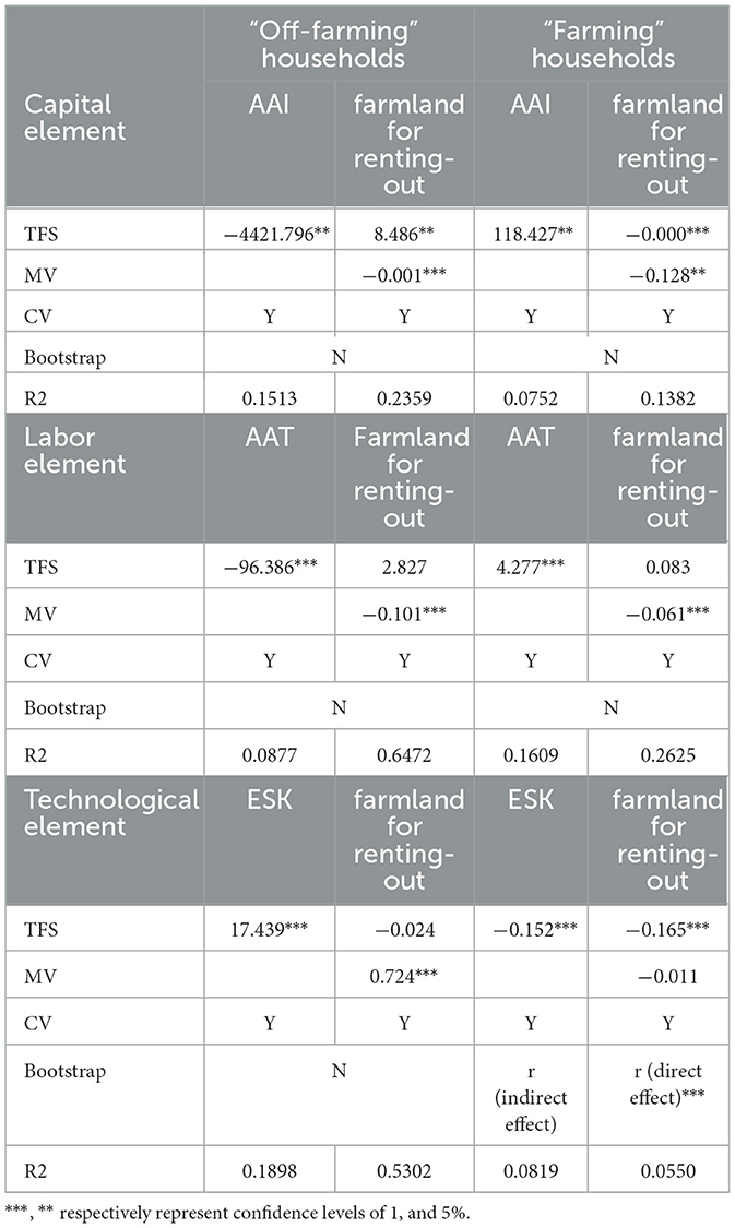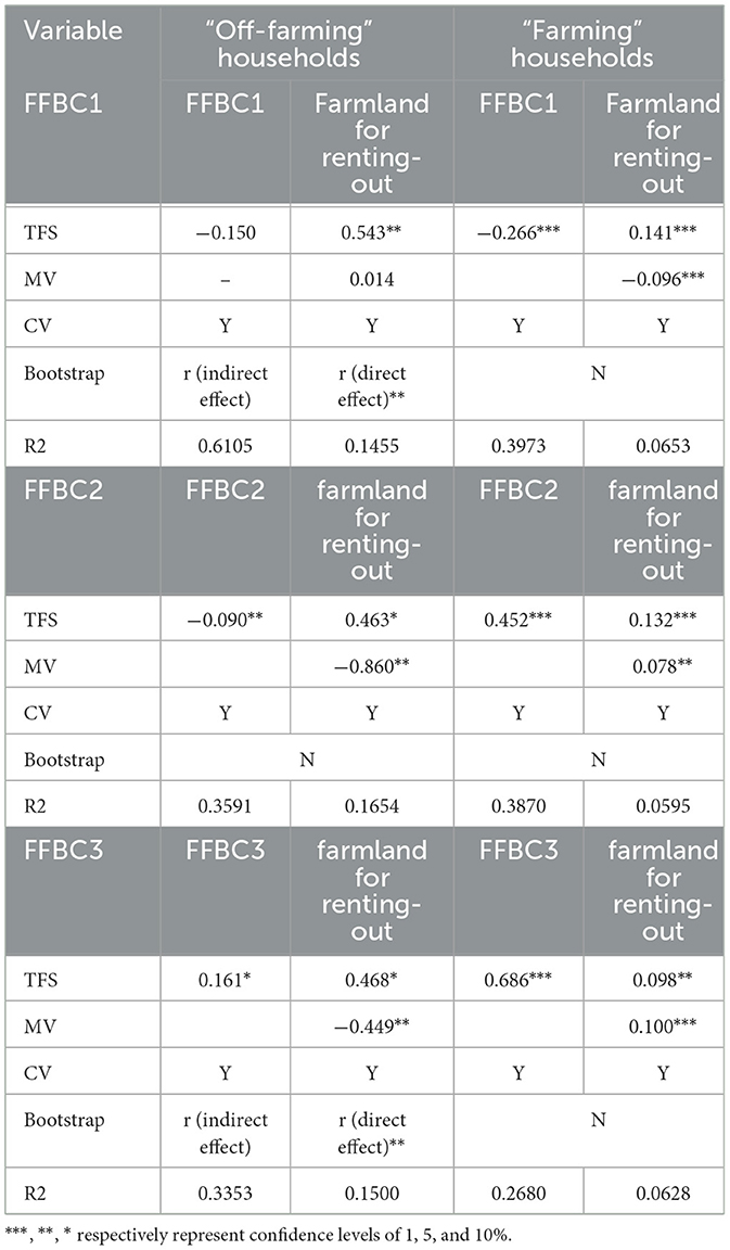The threshold tradeoff framework reveals that the intensity of MFU has a heterogeneous effect on the farmland renting-out between farming households and off-farming households. However, the impact mechanism of MFU on farmland renting-out is not very clear, which may result in missing out on more information. Based on the above information, we discuss the impact mechanism of the heterogeneous responses of MFU on household renting-out behavior by using the mesomeric effect test. The dual-threshold framework reveals that the mechanisms through which MFU influences farmland renting-out bifurcate along both intensity (TFS) and structural (FFBC) axes, mediated by heterogeneous factor allocations and functional trade-offs.