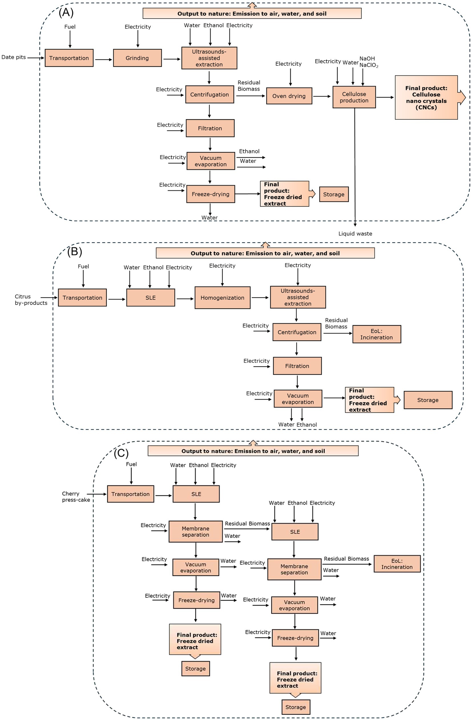 Figure 1. System boundaries for the three scenarios analyzed (A) date pits powder, (B) citrus by-products (C) cherry press-cake.