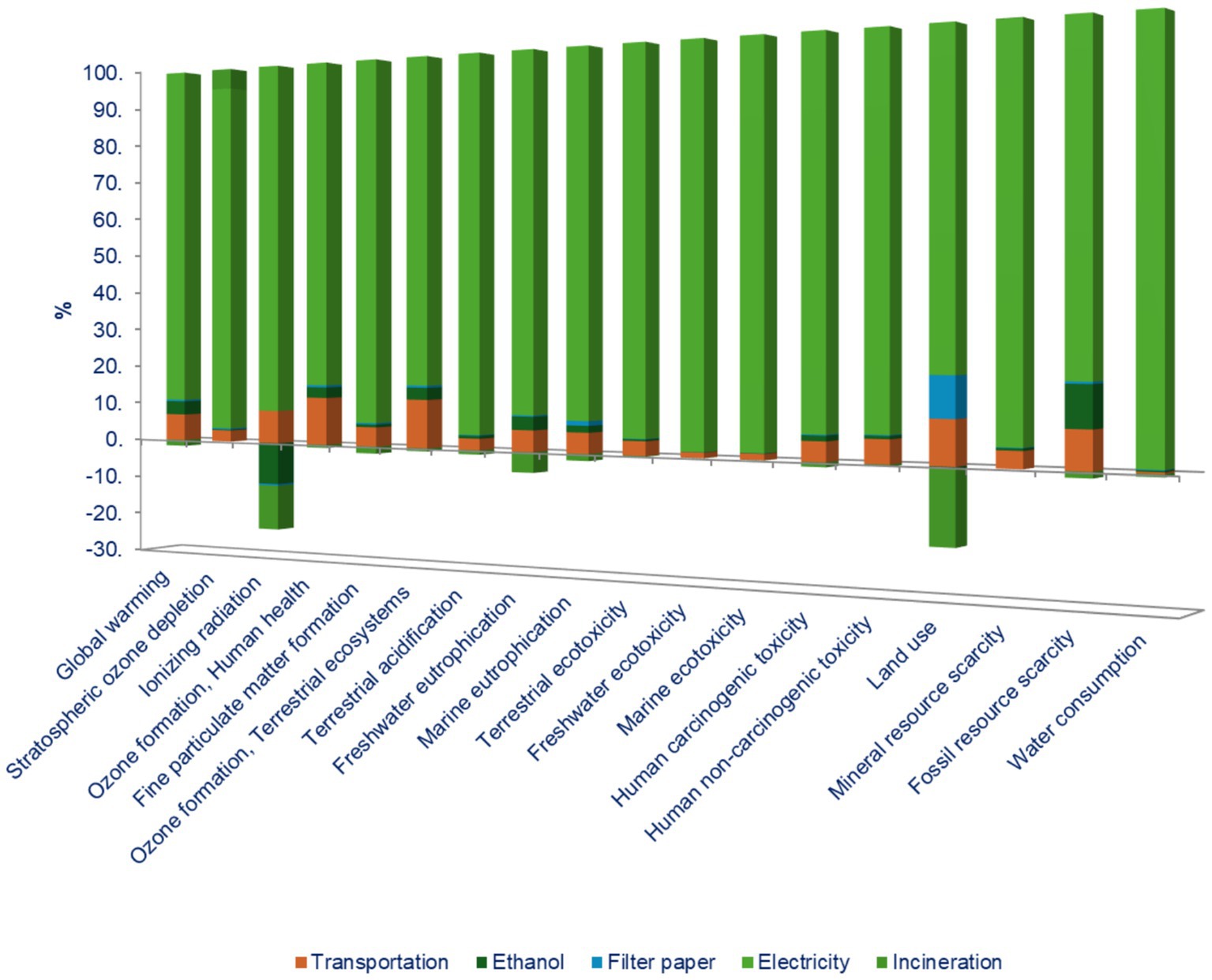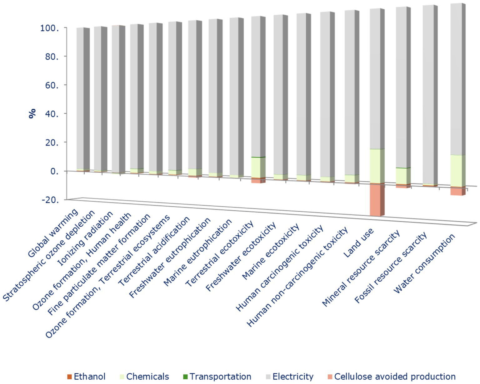 In contrast, the citrus by-products scenario showed low environmental impacts across almost all categories, with most contributions falling below 10% and, in some cases approaching zero, such as in stratospheric ozone depletion, ionizing radiation, and terrestrial acidification. Exceptions are observed in marine eutrophication, freshwater ecotoxicity, and land use, where moderate environmental impacts occurred. The overall low environmental footprint of this process is attributed to efficient ethanol recovery, simplified processing steps, and the incineration of residual biomass, an approach that not only avoids further processing but also provides environmental credits through energy recovery.
