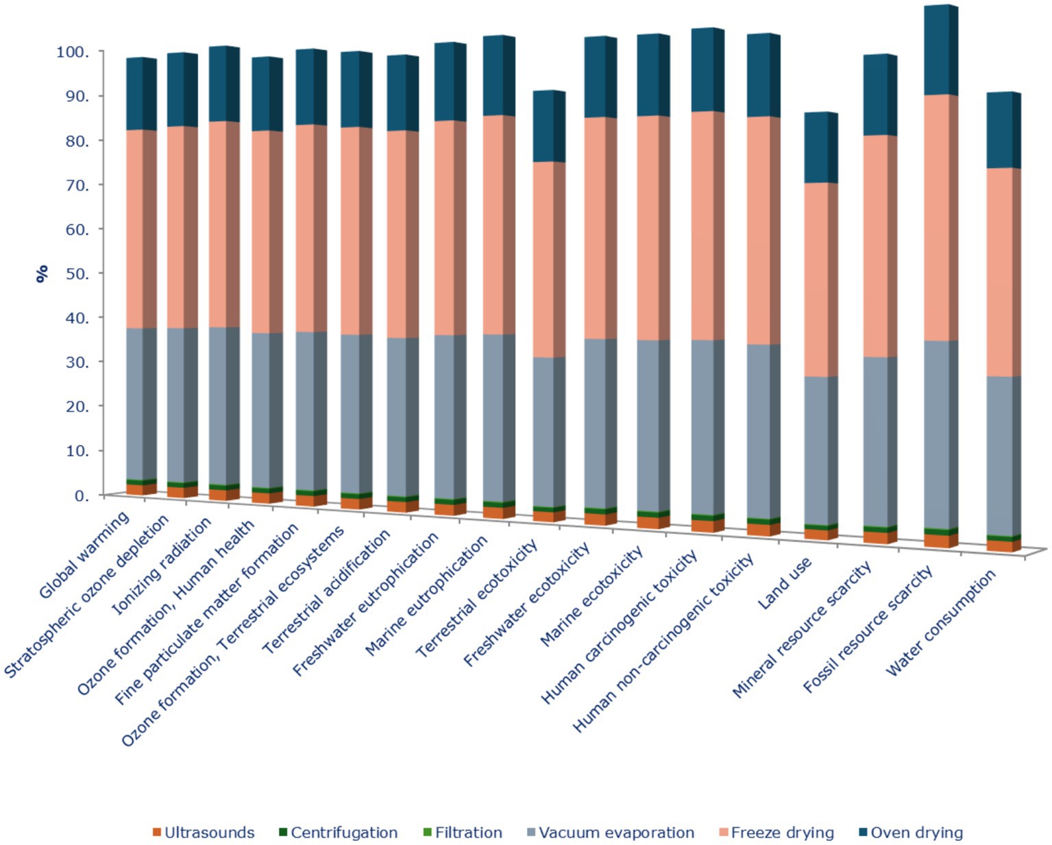 Figure 5. Relative contributions (%) of the energy-consuming phases of the citrus by-products’ extraction process to each environmental impact category analyzed.