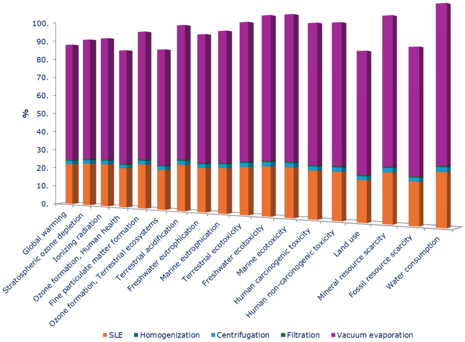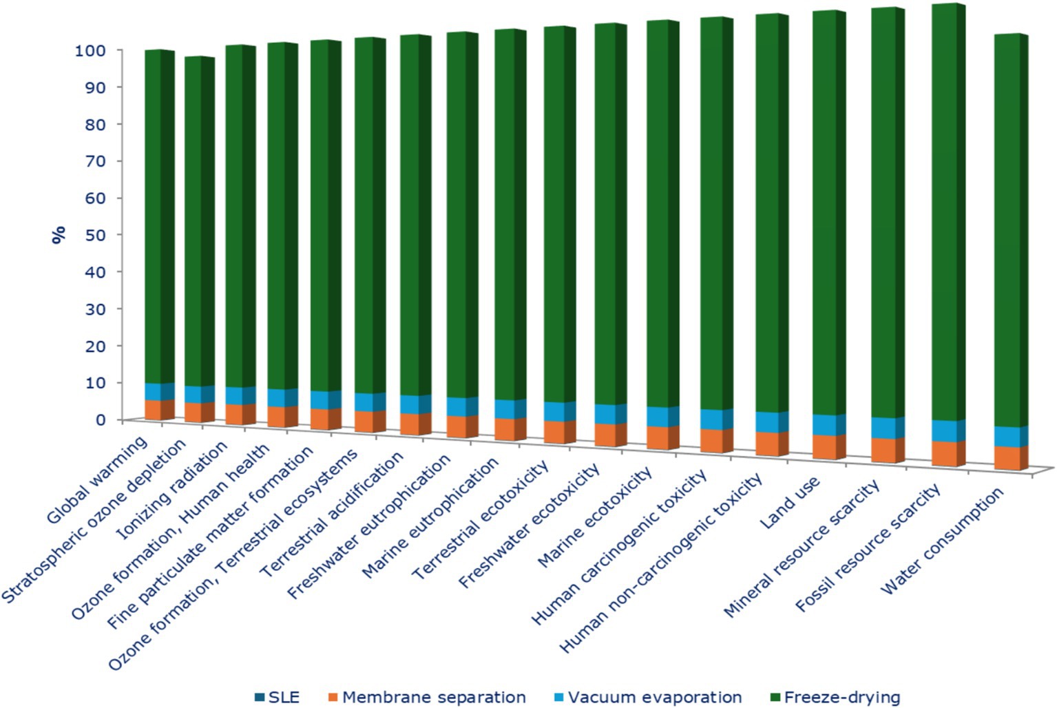 Electrical energy consumption emerged as the dominant contributor to the environmental profile. It accounted for nearly the entire impact across all categories, with the lowest relative contribution still reaching 93% in the water consumption category. Specifically, the vacuum evaporation and freeze-drying steps were identified as the most impactful unit operations, together representing approximately 80% of the total electrical energy consumption, as illustrated in Figure 7, highlighting the high potential for implementing energy-saving measures.