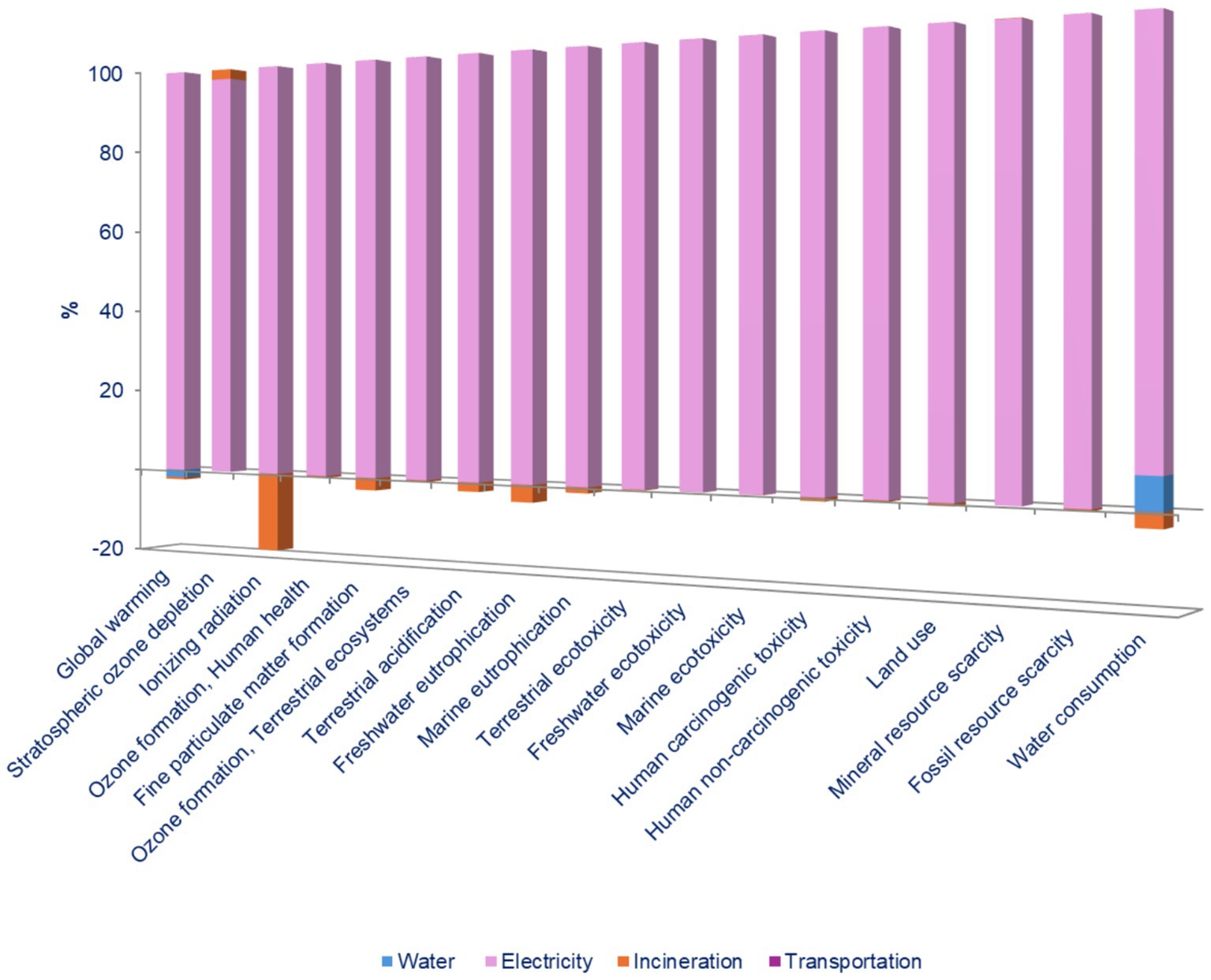 Figure 4. Relative contributions (%) of the citrus by-products’ extraction process to each environmental impact category analyzed.
