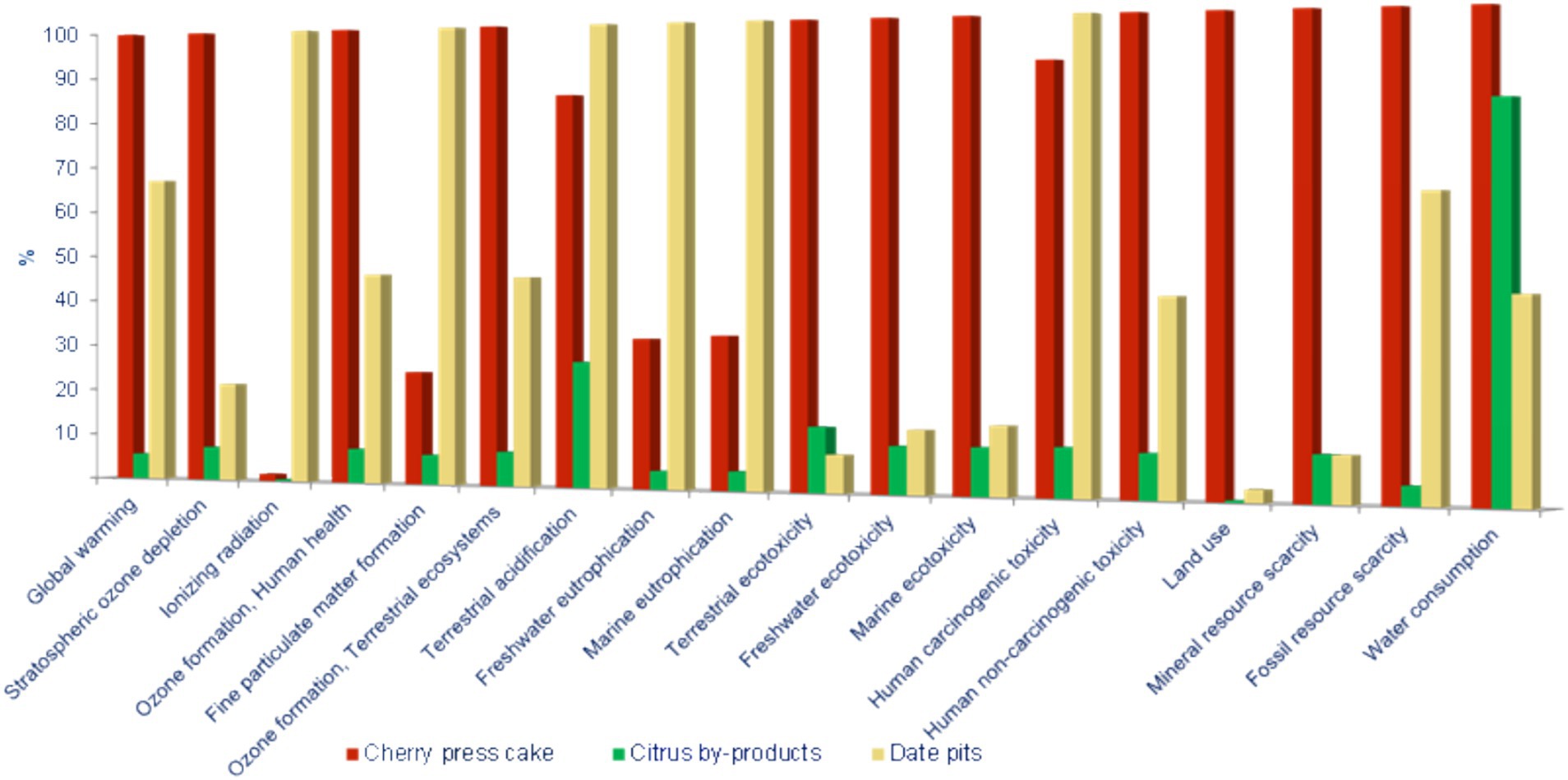 Figure 8. Comparison of the environmental impact categories of the three scenarios analyzed: date pits powder, citrus by-products and cherry press-cake.