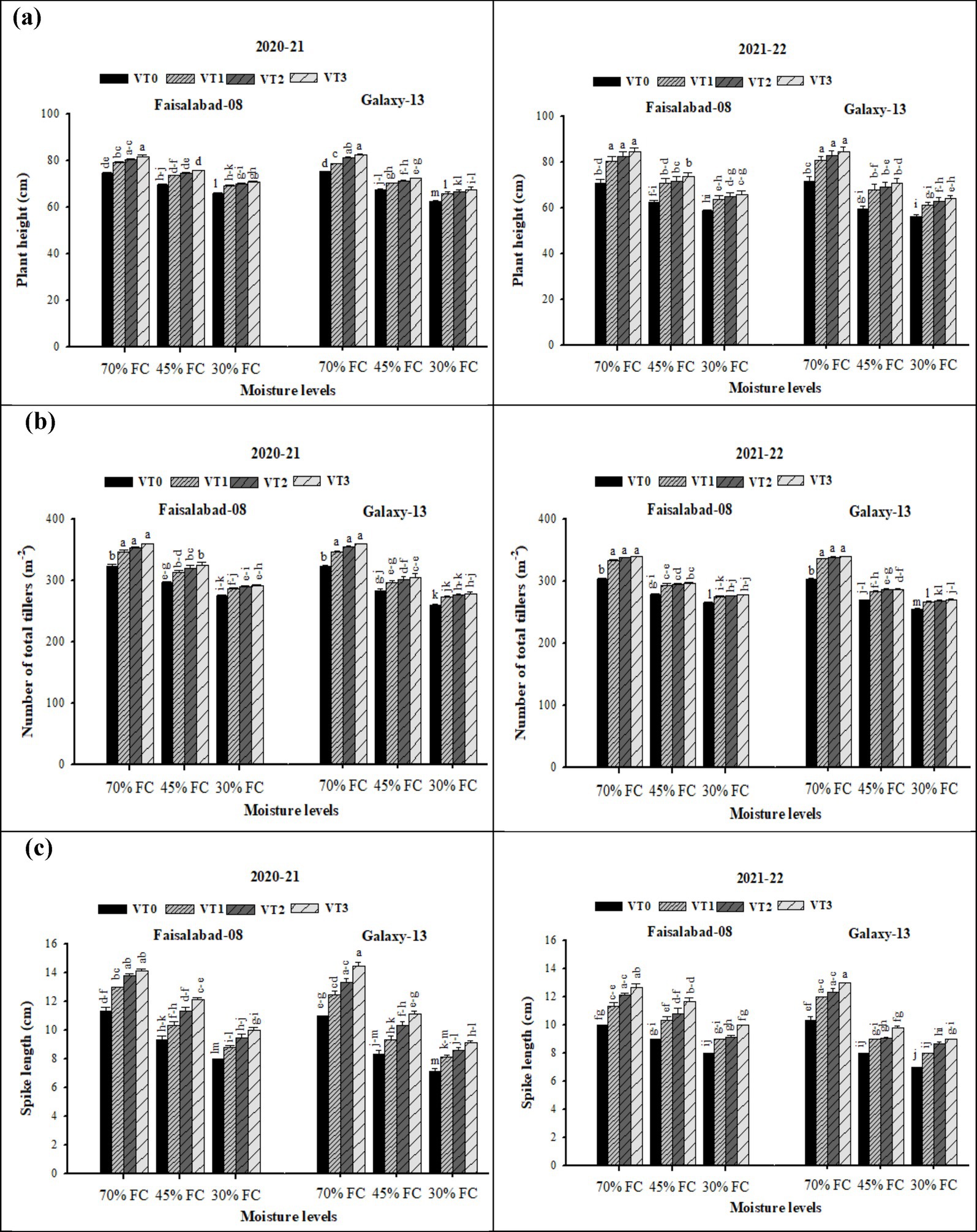 Figure 1. (a–c) Effects of soil applied with wheat straw, rice straw, and cow dung vermicompost on plant height, number of total tillers, and spike length of both wheat varieties under three water scarcity levels. Tukey’s HSD test shows that bars with changed alphabetical letters differ significantly at a 5% probability level.