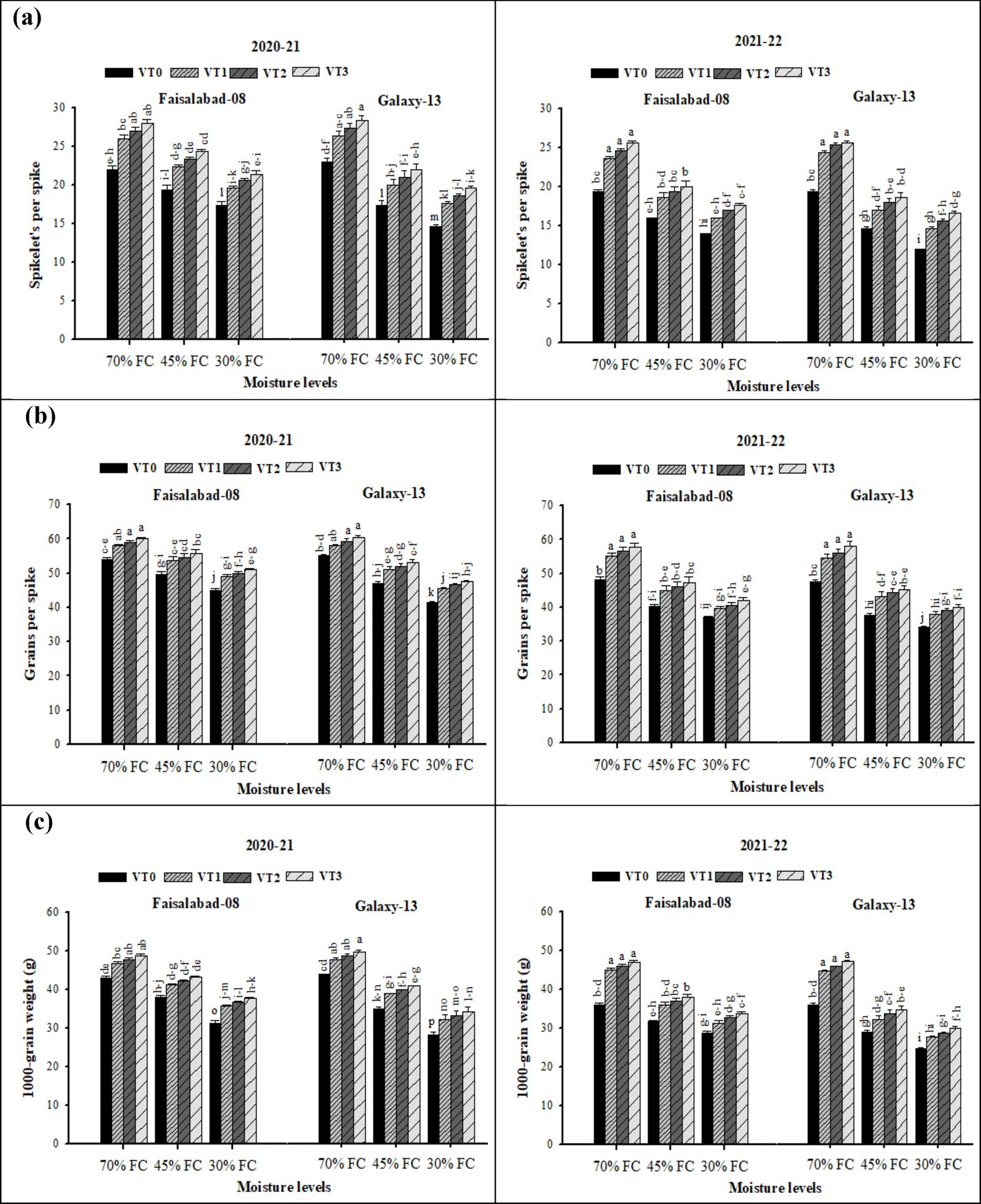 Figure 2. (a–c) Effects of soil applied with cow dung, wheat, and rice straw vermicompost on the spikelets per spike, grains per spike, and thousand-grain weight of both wheat varieties under various drought levels. Tukey’s HSD test shows that bars with varying alphabetical letters differ significantly at a 5% probability level.