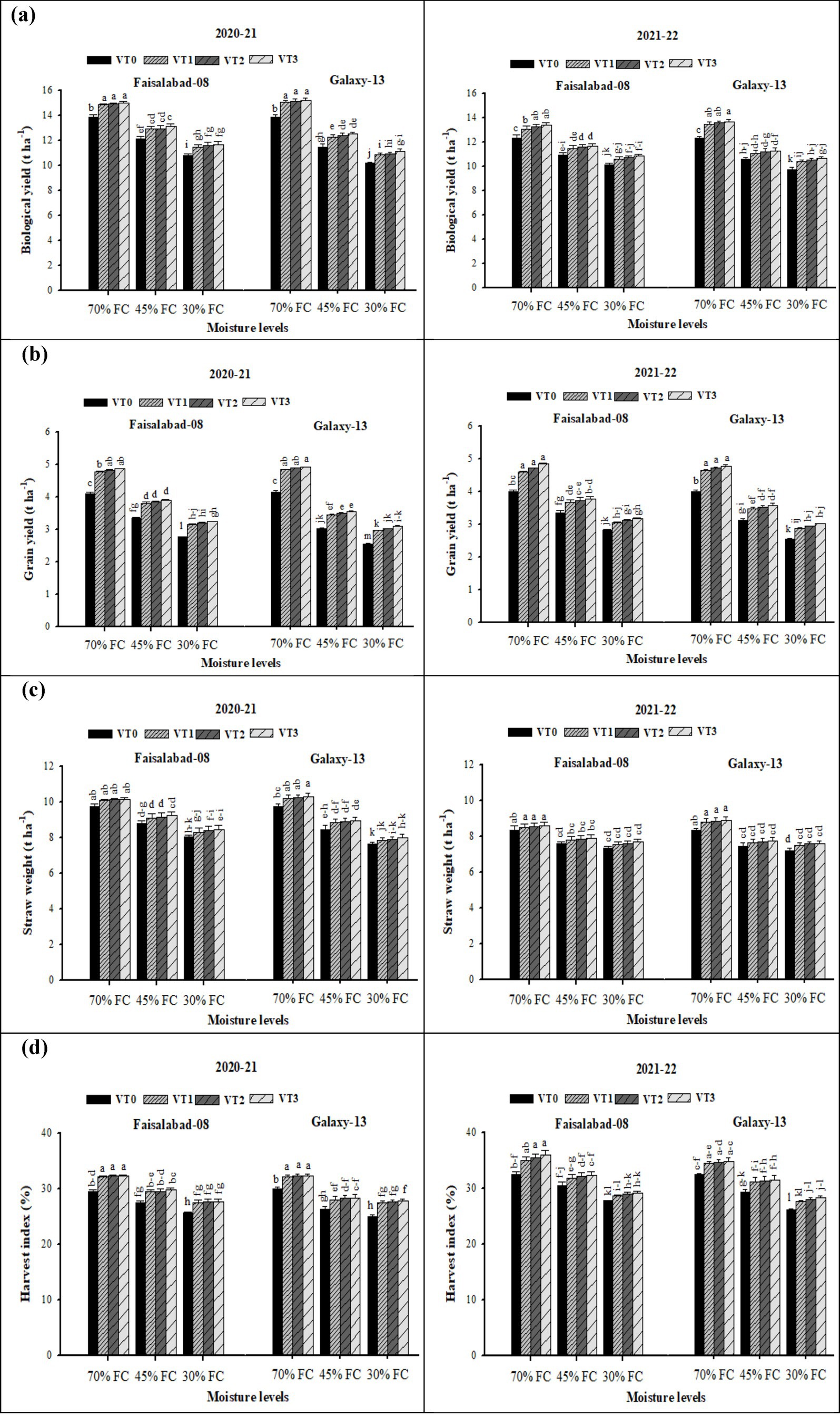 Figure 3. (a–d) Effects of soil applied with wheat straw, rice straw, and cow dung vermicompost on biological yield, grain yield, straw weight, and harvest index of two wheat cultivars under different drought levels. Tukey’s HSD test shows that bars with different alphabetical letters differ significantly at a 5% probability level.