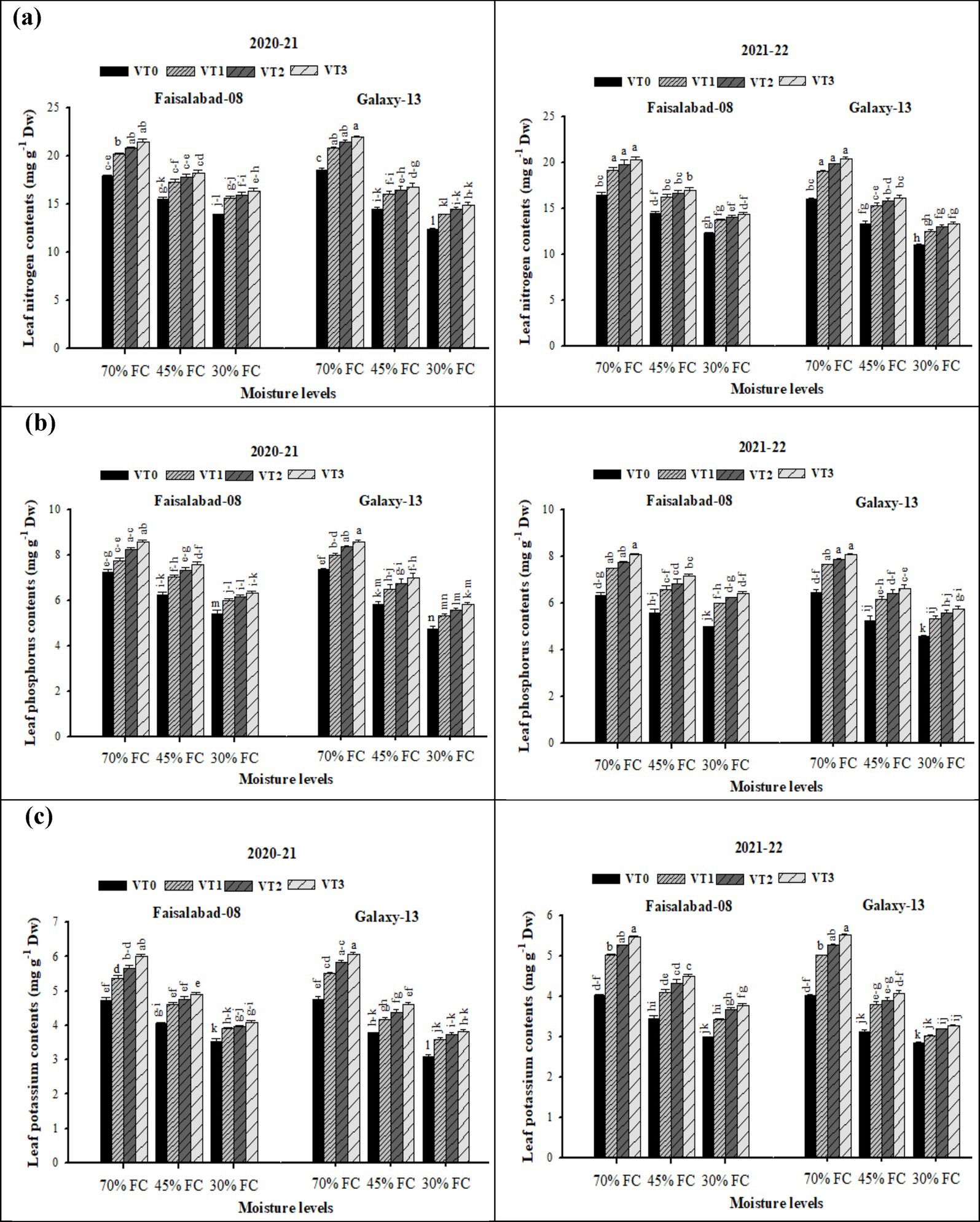 Figure 4. (a–c) Effects of soil applied with wheat straw, rice straw, and cow dung vermicompost on leaf NPK concentration of both varieties under different drought levels. Tukey’s HSD test shows that bars with changed alphabetical letters differ significantly at a 5% probability level.