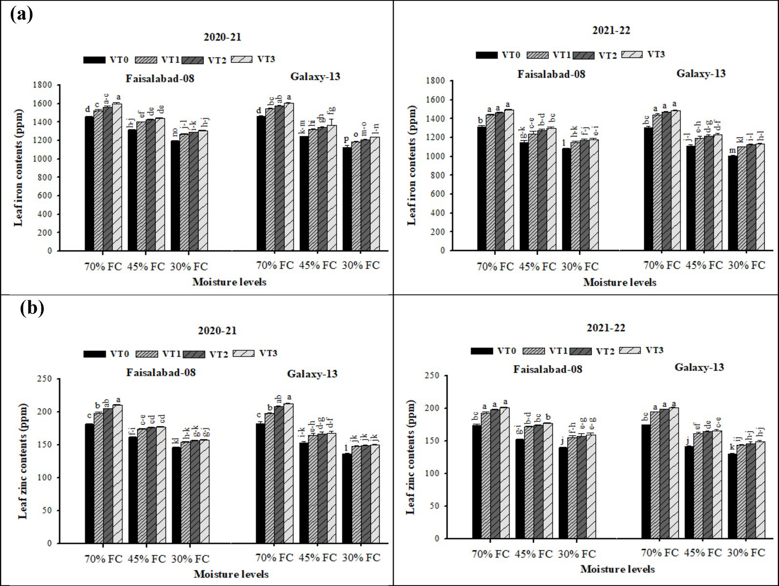 Similarly, leaf Fe and Zn contents (Supplementary Table S7 and Figure 5) were strongly affected by moderate and severe drought stress conditions in both years. Vermicompost application significantly enhanced leaf Fe and Zn contents under drought stress, with the greatest response observed to CDv (6 t ha−1), followed by RSv (6 t ha−1), and WSv (8 t ha−1). The lowest values were recorded in the control across both cultivars. Consistent with NPK results, Faisalabad-08 maintained higher leaf Fe and Zn contents than Galaxy-13 under moderate and severe drought conditions.