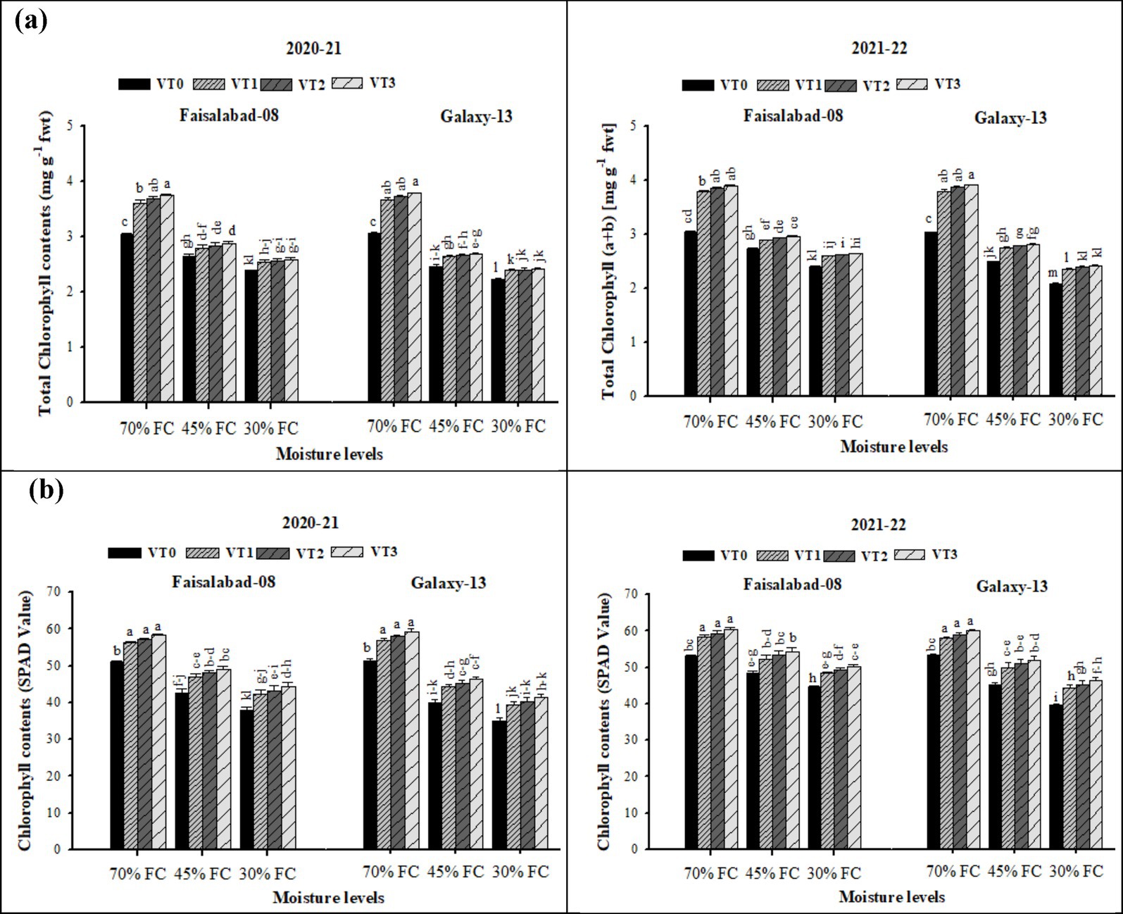 Chlorophyll plays a vital role in photosynthesis, crop growth, and yield (Lawlor, 2002). In the present study, water scarcity significantly reduced chlorophyll content in both wheat cultivars. However, the drought-tolerant cultivar Faisalabad-08 maintained relatively higher chlorophyll under moderate and severe water stress compared to drought-sensitive wheat cultivar Galaxy-13 (Ibrahim et al., 2021). Plants with higher chlorophyll typically accumulate more photosynthates, leading to stronger roots, shoots, and leaves. Vermicompost has been widely recognized for improving plant physiological functions and mitigating stress conditions (Jat and Ahlawat, 2006; Hosseinzadeh et al., 2016). Recent studies indicate that optimized VT applications reduce the adverse effects of water stress in wheat by enhancing and sustaining chlorophyll a, total chlorophyll, and SPAD values. Flexibility in growth parameters such as leaf area index (LAI), leaf area duration (LAD), and crop growth rate (CGR) of wheat under different VTs was linked to variable soil moisture levels. These growth parameters were highest under CDv (6 t ha−1), followed by RSv (6 t ha−1) and WSv (8 t ha−1) across both cultivars under moderate drought (45% FC), severe drought (30% FC), and well-watered (70% FC) conditions. The lowest growth responses were observed under severe drought without VT application. Similar results were also reported by Ahmad et al. (2021), who found significant changes in LAI, LAD, and CGR. Beyond improving growth indices, vermicompost also enriched the soil with nutrients, organic matter, humic acid, beneficial microbes, actinomycetes, and various growth-promoting regulators (Aslam et al., 2021).