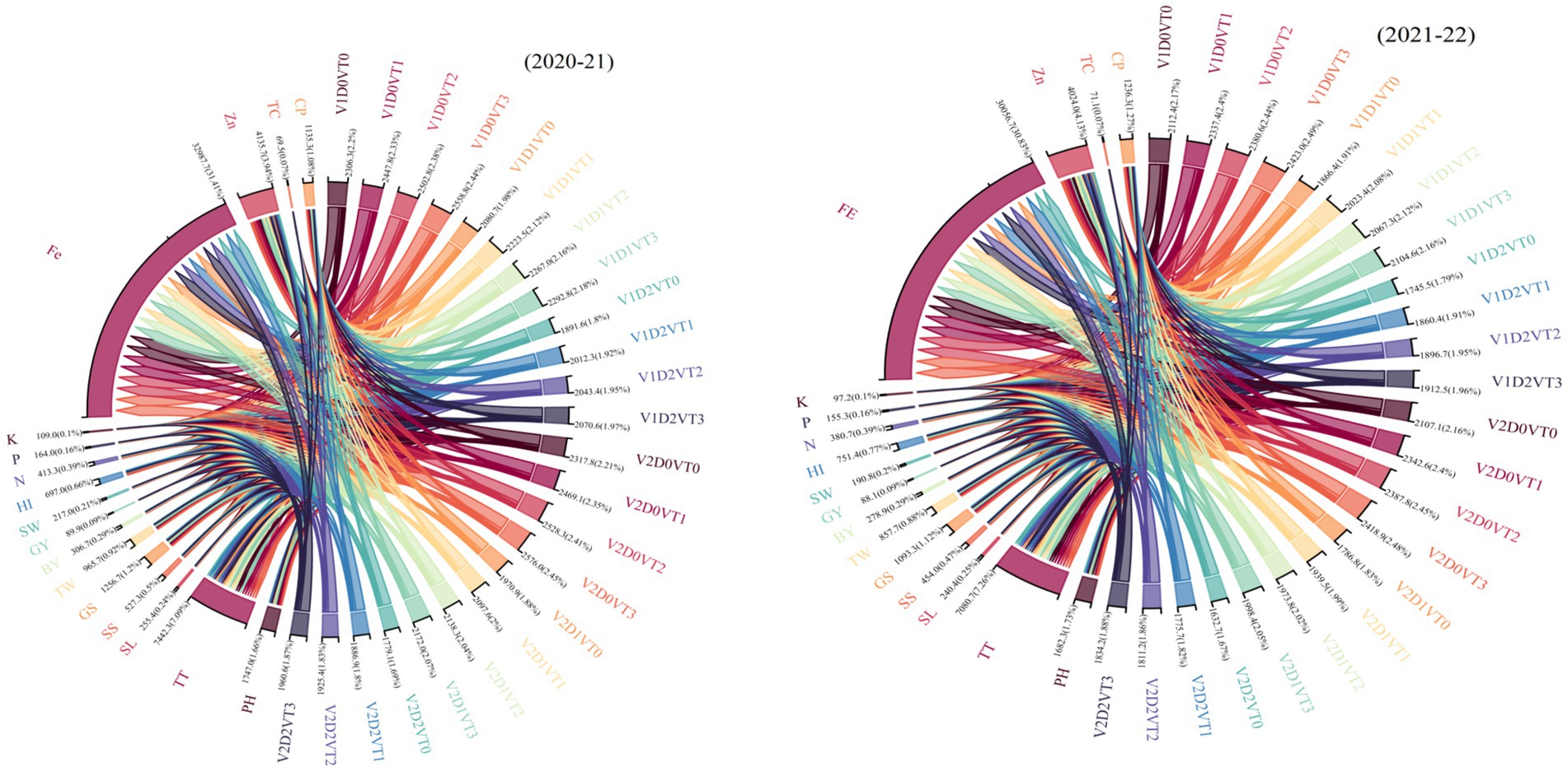 The chord diagram illustrates the interrelationships among agronomic, physiological, and nutrient traits of wheat cultivars under different soil moisture regimes during the 2020–2021 and 2021–2022 growing seasons (Figure 7). Strong associations were observed between GY and key traits such as BY, HI, and TGW, emphasizing their pivotal role in yield determination. Similarly, nutrient traits such as leaf N, P, and K showed significant interconnections, reflecting their combined influence on plant growth and productivity. Architectural characteristics, such as plant height (PH), spike length (SL), and number of total tillers (TT), also displayed notable associations, indicating their importance in cultivar adaptability under contrasting soil moisture conditions. Similarly, physiological parameters, particularly chlorophyll contents (CP) and total chlorophyll contents (TC), were closely linked with nutrient traits, indicating their role in maintaining photosynthetic efficiency and nutrient uptake under varying water availability. Additionally, traits such as grains per spike (GS), spikelets per spike (SS), and straw weight (SW) demonstrated moderate associations with yield-related parameters, revealing their indirect contributions to productivity.