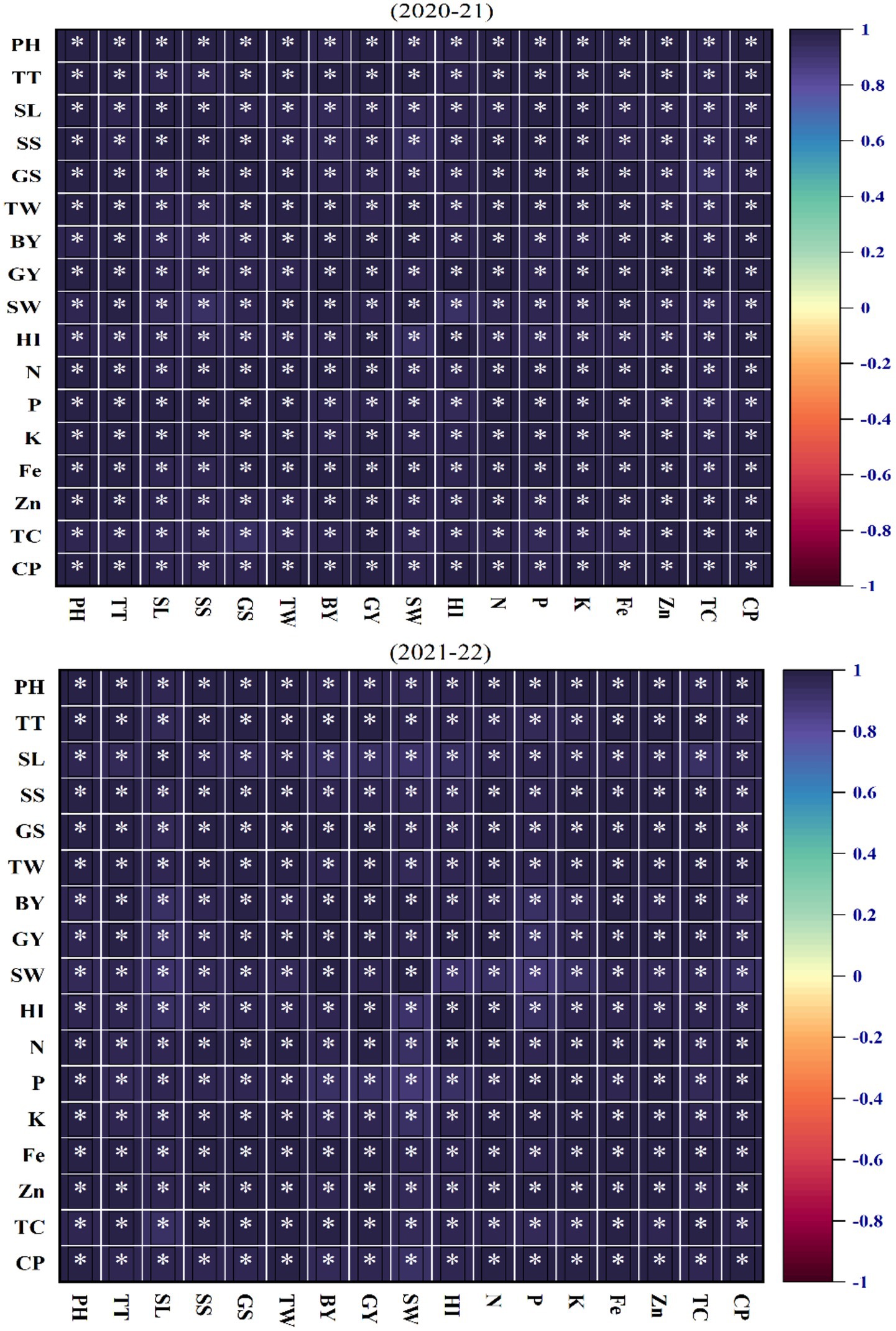 Figure 8. The correlation analysis for the 2-year study (2020–2021 and 2021–2022) highlights the relationship between physiological, agronomic, and nutrient traits in wheat cultivars under varying moisture conditions. CP, chlorophyll contents; TC, total chlorophyll contents; Zn, leaf zinc contents; Fe, leaf iron contents;, K, leaf potassium contents; P, leaf phosphorus contents; N, leaf nitrogen contents; HI, harvest index; SW, straw weight; GY, grain yield; BY, biological yield; TW, thousand-grain weight; GS, grains per spike; SS, spikelets per spike; SL, spike length; TT, number of total tillers; PH, plant height.