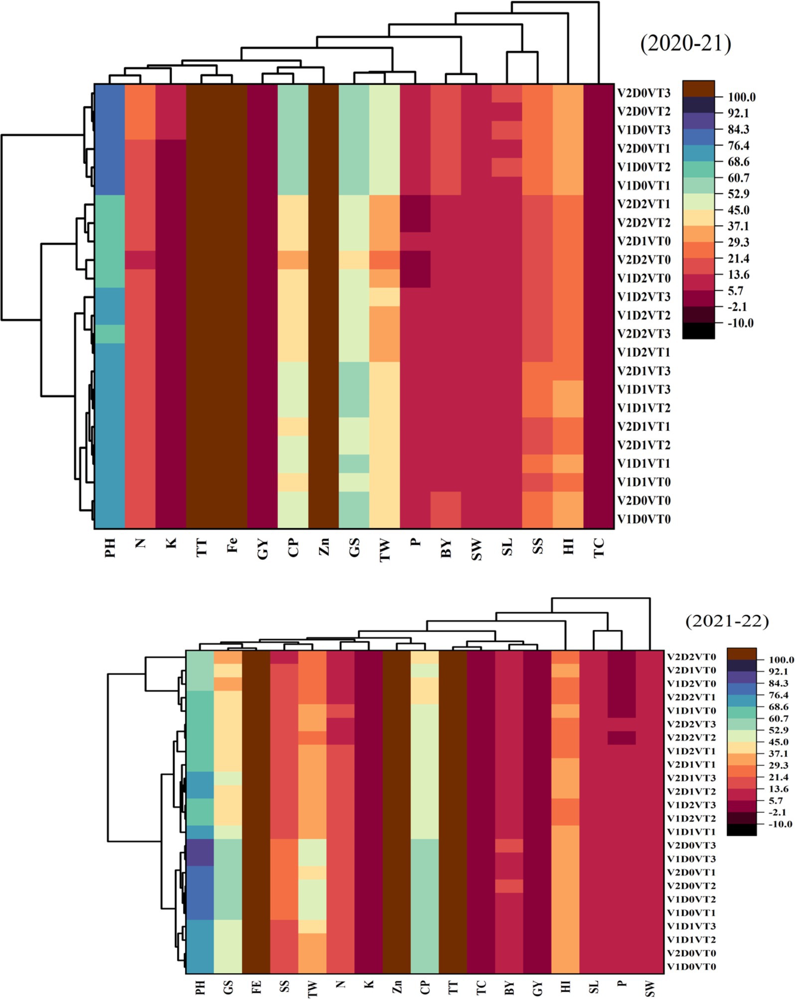 Figure 9. The heatmap analysis for this 2-year study (2020–2021 and 2021–2022) offers a clear visualization of the strength and direction of relationships among physiological, agronomic, and nutrient traits in wheat cultivars under different moisture regimes. CP, chlorophyll contents; TC, total chlorophyll contents; Zn, leaf zinc contents; Fe, leaf iron contents; K, leaf potassium contents; P, leaf phosphorus contents; N, leaf nitrogen contents; HI, harvest index; SW, straw weight; GY, grain yield; BY, biological yield; TW, thousand-grain weight; GS, grains per spike; SS, spikelets per spike; SL, spike length; TT, number of total tillers; PH, plant height.