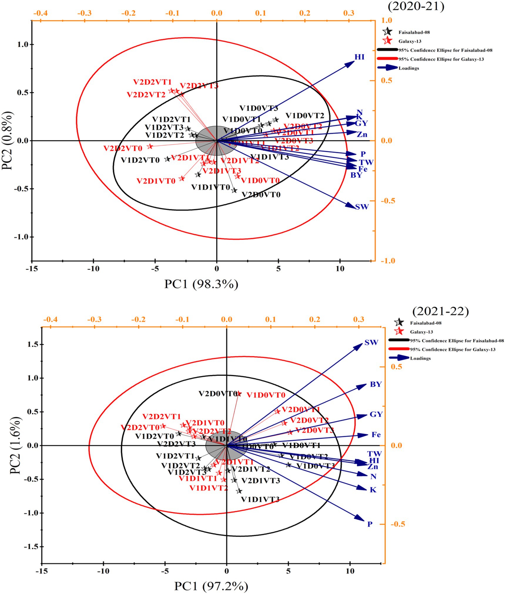 The principal component analysis (PCA) plots revealed the relationships among different traits across the 2-year study (2020–2021 and 2021–2022). In both years, principal component 1 (PC1) accounted for the majority of variation (98.3% in 2020–2021 and 97.2% in 2021–2022), while principal component (PC2) explained a much smaller proportion (0.8 and 1.6%, respectively) (Figure 10). Key traits such as leaf Zn, Fe, K, P, HI, and TGW contributed strongly to PC1 and played a critical role in separating the two groups: Galaxy-13 and Faisalabad-08. The 95% confidence ellipses indicated some overlap between the two groups, though they were partially distinct. In 2020–2021, traits like HI, Fe, and Zn were highly associated with positive PC1 values, differentiating the groups. PC2 contributed minimally, suggesting that variables along this axis have a smaller influence. In 2021–2022, the importance of SW (straw weight) increased slightly, and PC2 explained slightly more variation compared to the previous year. This year also showed slightly more overlap between Galaxy-13 and Faisalabad-08, indicating reduced differentiation. Traits like grain yield (GY), biological yield (BY), and leaf N remained less influential compared to those associated with PC1. Overall, HI, Zn, Fe, and P consistently emerged as the most discriminating traits across both years, while minor shifts in PC2 indicated year-to-year variability in trait associations. These findings provide useful insights for identifying key traits in the evaluation of wheat performance under varying conditions.