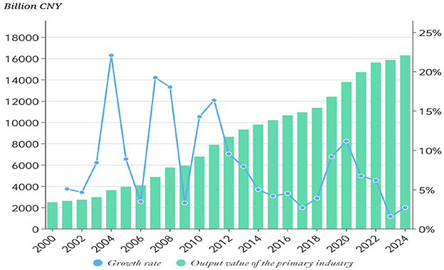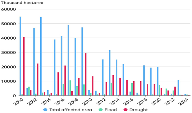 A strong country must first strengthen agriculture, and only when agriculture is strong can the country be strong. An agricultural power is the foundation of a modern socialist power. In view of this, the Chinese government has always attached great importance to the work of “rural areas, rural areas, and rural areas.” From 2004 to the present, the No. 1 document of the Central Committee has always been with the theme of “three rural areas” and has continuously issued documents to strengthen the policy of financial support for agriculture and promote the coordinated development of urban and rural areas. The 2025 Chinese government work report further pointed out that “efforts should be made to do a good job in the work of ‘three rural areas' and further promote the comprehensive revitalization of rural areas.” As a basic industry of the national economy, the improvement of agricultural resilience (AR) is crucial for ensuring national food security, promoting rural revitalization, and achieving sustainable economic development. Agricultural economic resilience means that agricultural economic systems can maintain stable operations, adapt quickly, and achieve sustainable development in the face of multiple challenges such as natural disasters, market fluctuations, and technological changes. At present, geopolitical conflicts are continuing, international trade conflicts are intensifying, extreme climate disasters are frequent, and the international environment is becoming increasingly turbulent. At the same time, the domestic “urban-rural dual structure” has not yet been broken, and the “scissors difference” between workers and peasants still exists, coupled with the inherent vulnerability characteristics of agriculture itself, resulting in a decline in the stability of our country's agricultural development and the urgent need to enhance the AR. As shown in Figure 1, the added value of China's primary industry has been continuously rising from 2000 to 2024, but the growth rate has fluctuated sharply. Especially since 2014, the growth rate of the total output of the primary industry has shown a significant downward trend. The growth rate in most years was less than 5%. The reasons for such fluctuations might be changes in market supply and demand, but they could also be natural factors. Natural factors, such as environmental pollution, climate change, and resource depletion, pose a serious threat to the sustainability of the food and agriculture system (Yang et al., 2025; Guo et al., 2023). As shown in Figure 2, China's agriculture has been severely affected by natural disasters, especially drought. It can be found from the data in Figures 1, 2 that the resilience of China's agriculture is strengthening. This can be observed from the affected area and the growth rate. For instance, in 2020, agriculture showed an upward trend due to the impact of natural disasters, yet the growth rate of agriculture also increased. However, due to the inherent fragility of agriculture, it is highly necessary to continuously enhance AR. From the perspective of social transformation, how to apply science and technology to enhance the resilience of agriculture is an urgent scientific issue that needs to be addressed at present.