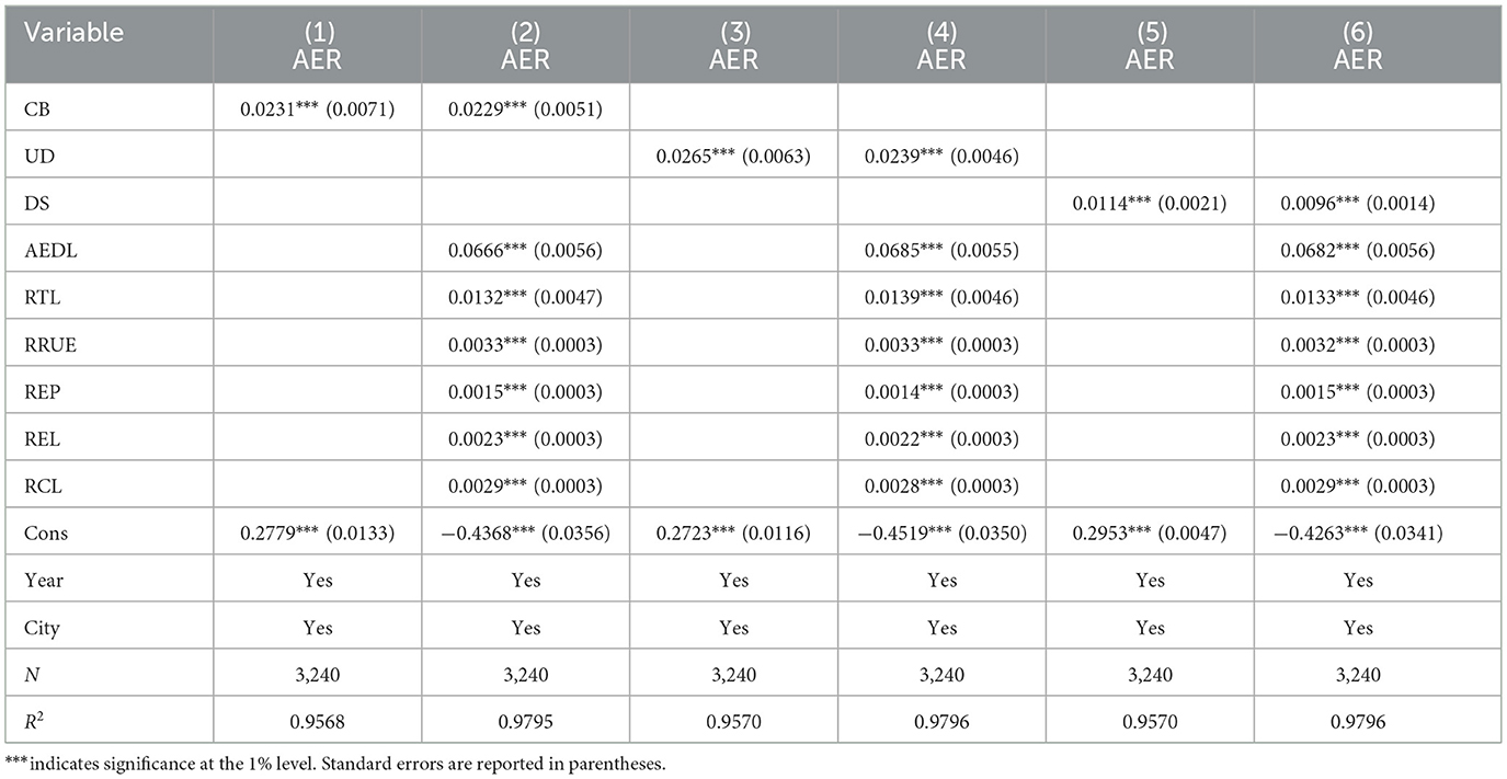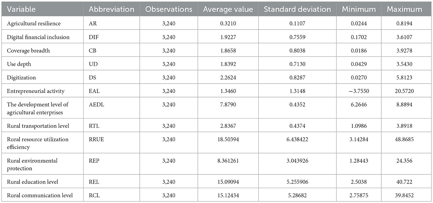 According to the published literature, six indicators related to agricultural economic resilience are selected as control variables (Xu, 2025; Xu and Lu, 2025). (1) Agricultural enterprise development level (AEDL). The logarithmic value of the main business income of agricultural product processing enterprises above a designated size. (2) Rural transportation level (RTL). It is expressed by the logarithmic value of the number of cars per 100 households. (3) Rural resource utilization efficiency (RRUE). It is expressed by the proportion of comprehensive utilization of livestock and poultry manure to the total amount of livestock and poultry manure generated. (4) Rural environmental protection (REP). It is expressed by the proportion of green vegetation coverage area to the total area of the village. (5) Rural education level (REL). It is expressed by the proportion of full-time teachers with bachelor's degrees or above in rural compulsory education schools in the total number of teachers. (6) Rural communication level (RCL). It is expressed by the proportion of administrative villages that have opened Internet broadband services to the total number of villages.