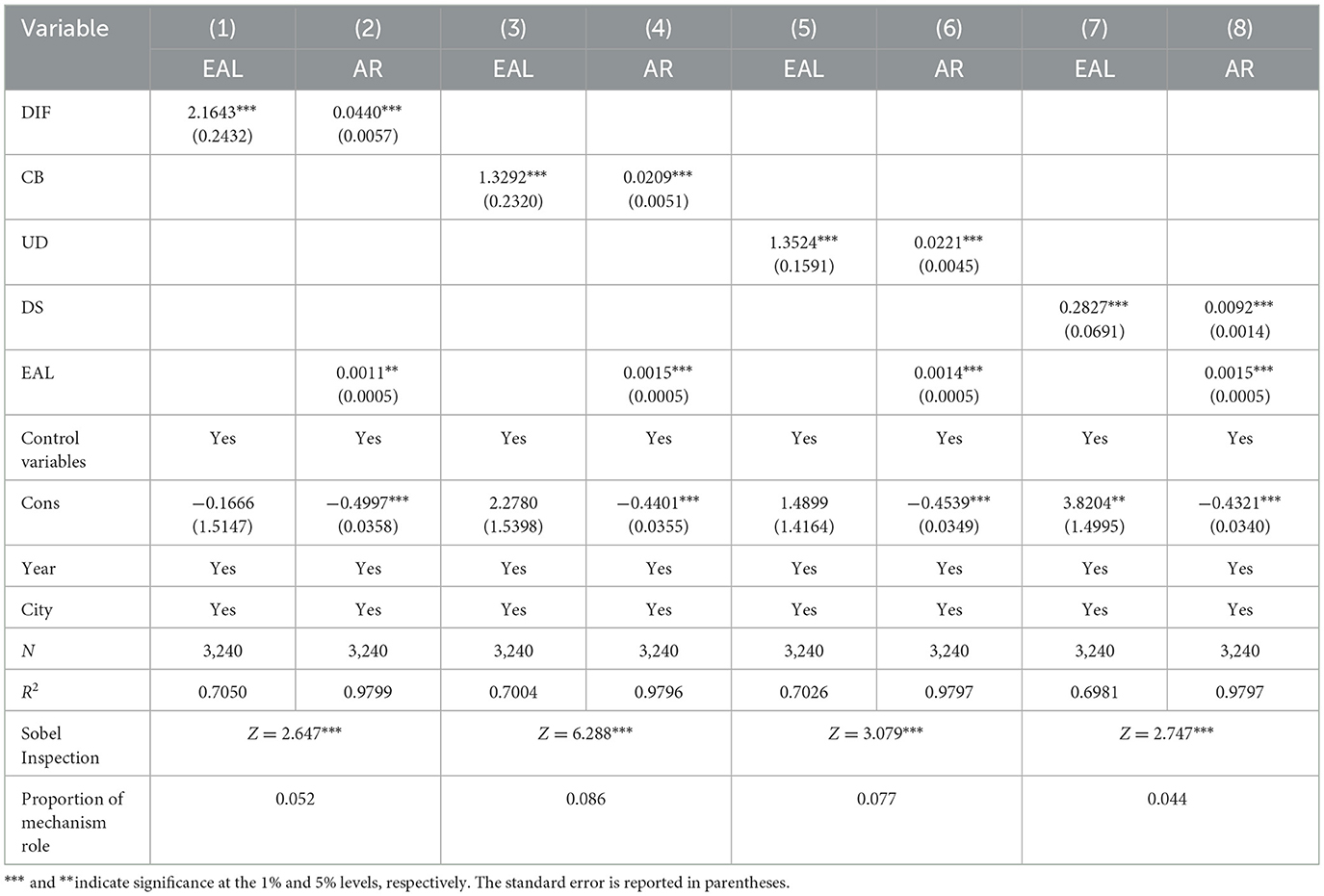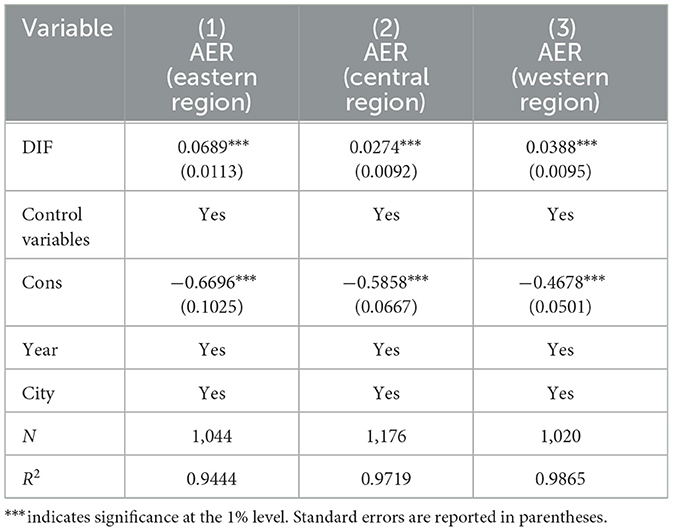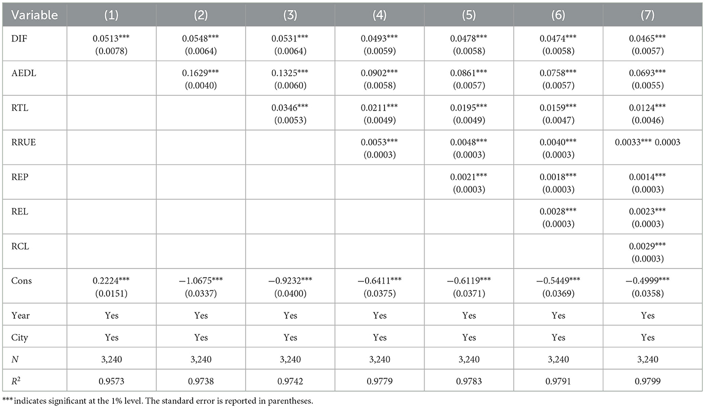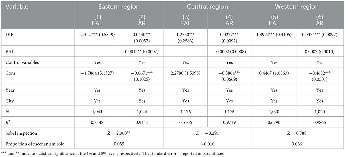To identify the mediating mechanism by which DIF affects the AR, this study, following the approach of the published literature, conducted an empirical test using a three-stage mediating effect model (Yang and Shen, 2023; Hu et al., 2025).