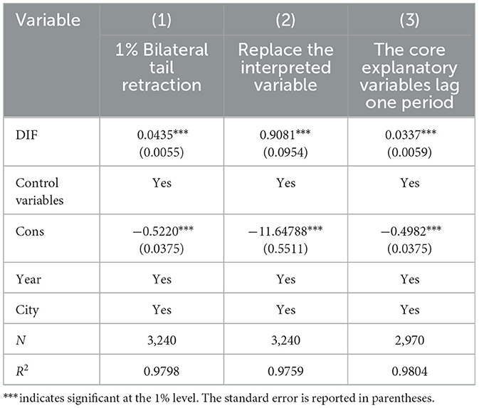 In order to verify the robustness of the benchmark regression results, the robustness of the model is tested by the following three methods: 1% bilateral tailing, replacement of interpreted variables, and lagging treatment of core explanatory variables. Table 4 shows the robustness test results, where Columns (1)–(3) are the robustness test results of 1% bilateral tailing treatment, replacement of the interpreted variable and the lag of the core explanatory variable by one period, respectively. The test results show that DIF still significantly enhances the AR at the 1% level. This proves that the benchmark regression results are reliable and robust.
