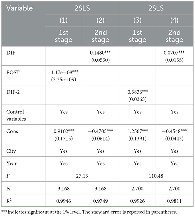 In order to avoid the endogenous problem caused by a mutual causal relationship, the instrumental variable method is used to carry out endogenous analysis. In the process of selecting instrumental variables, based on the ideas that have already been published, the interaction between the number of post offices per 100 people and the number of Internet users in the previous year, as well as the digital inclusive financial index that lags two periods behind, are selected as two instrumental variables (Huang et al., 2025; Li and Han, 2025; Su et al., 2025). The early Internet infrastructure had a very weak correlation with the economic growth of modern agriculture. It took a long time for Internet applications to rise in rural areas. As an important channel for economic exchanges and shipping cooperation, the post office made a significant contribution to economic growth when information technology was not yet widely applied. With the increasing demand for information exchange among people, traditional mail delivery cannot meet the needs of residents. This has directly led to the rapid development of the Internet, digital connectivity and digital finance. Therefore, post offices have historically promoted economic development, and their density has also influenced economic intensity. Therefore, we have reason to believe that instrumental variables meet the requirements of correlation and exclusivity.