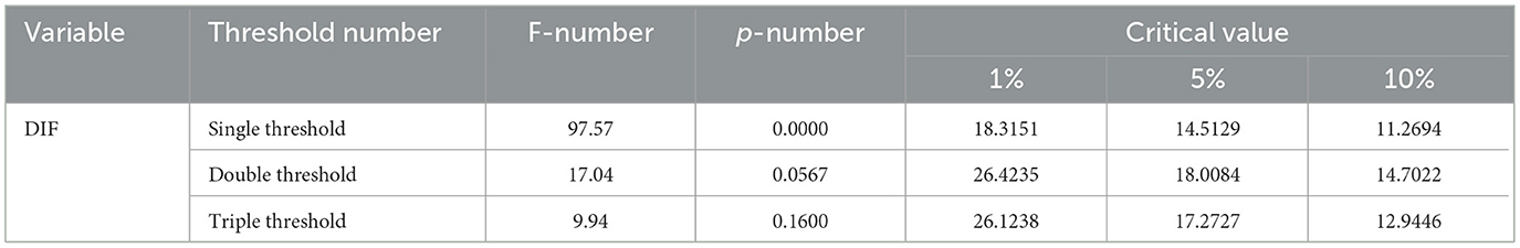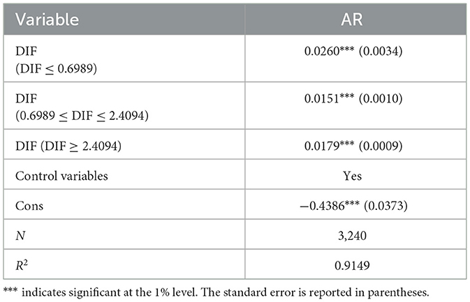 The critical value theory holds that if market entities want to utilize external resources, they must first possess certain internal capabilities to absorb and transform them. DIF varies significantly in different regions and at different stages, and thus, the resulting impact effects will also differ. Both theory and reality strongly suggest that the relationship between DIF and AR is more likely to be non-linear. Its influence may have critical points or thresholds. Before and after reaching these points, the influence mechanism, direction, and even magnitude will undergo significant changes. Ignoring this non-linearity may lead to biased or even incorrect conclusions. In order to determine the number of thresholds, the threshold effect is tested. Table 8 shows the test data for the threshold effect. The test results show that the model passes the single threshold effect and double threshold effect at the significance level of 1% and 10%, respectively, while the triple threshold effect test fails. Based on this, it was decided to construct a double threshold model to explore the non-linear effect of DIF on AR.