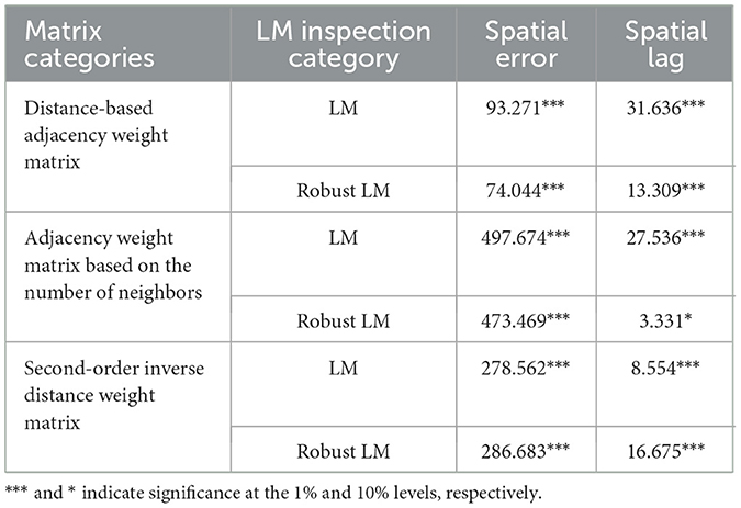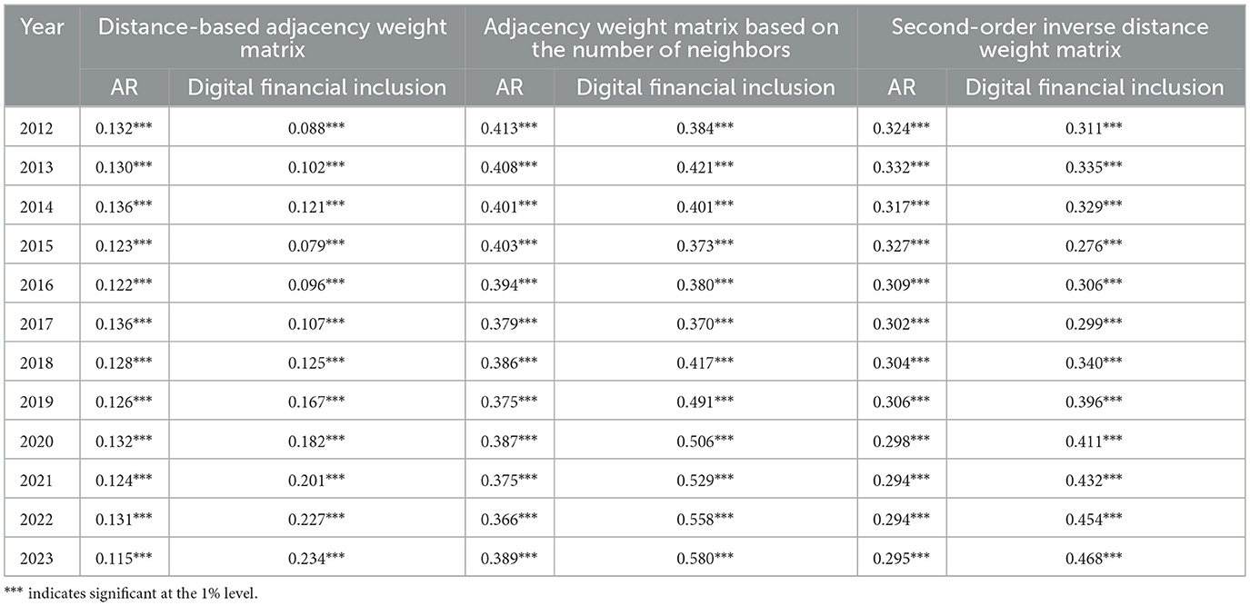 Spatial externality holds that the behavior of one entity will have non-market impacts on other entities adjacent to it in space, including positive externalities and negative externalities. Just as economic geography reveals, there are extensive and close spatial correlations among economic affairs (Liu and Lian, 2025; Zheng et al., 2025). Agricultural economic activities and financial activities are by no means operating independently in a “vacuum”; they have profound spatial correlations. Ignoring this correlation will lead to incorrect model Settings, resulting in biased estimation results and missing key mechanisms of action. First, the spatial autocorrelation test is carried out on the explained variables and the core explanatory variables to judge the necessity of spatial econometric analysis. In order to improve the robustness of the test results, the global Moran index from 2012 to 2023 is calculated under three spatial weight matrices: distance-based adjacency weight matrix, adjacency weighting matrix based on proximity number, and second-order inverse distance weight matrix. Table 10 shows that among the three spatial weight matrices, the global Moran index of AR and DIF over the years is significantly positive at the 1% significance level, indicating that there is spatial autocorrelation between these two variables. Therefore, it is necessary to further construct a spatial econometric model to carry out the analysis of the spatial spillover effect.