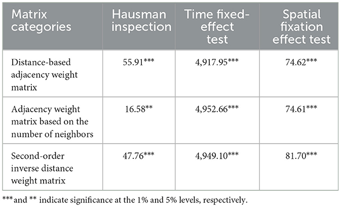 Table 12 shows the results of the fixed effect test. The results show that under the three spatial weight matrices, the models all pass the Hausman test, so it is decided to use the fixed-effect model, and both pass the significance test in the test of time fixation and space fixed effect, so the spatial and spatial double fixed space lag model is finally used for spatial econometric analysis.