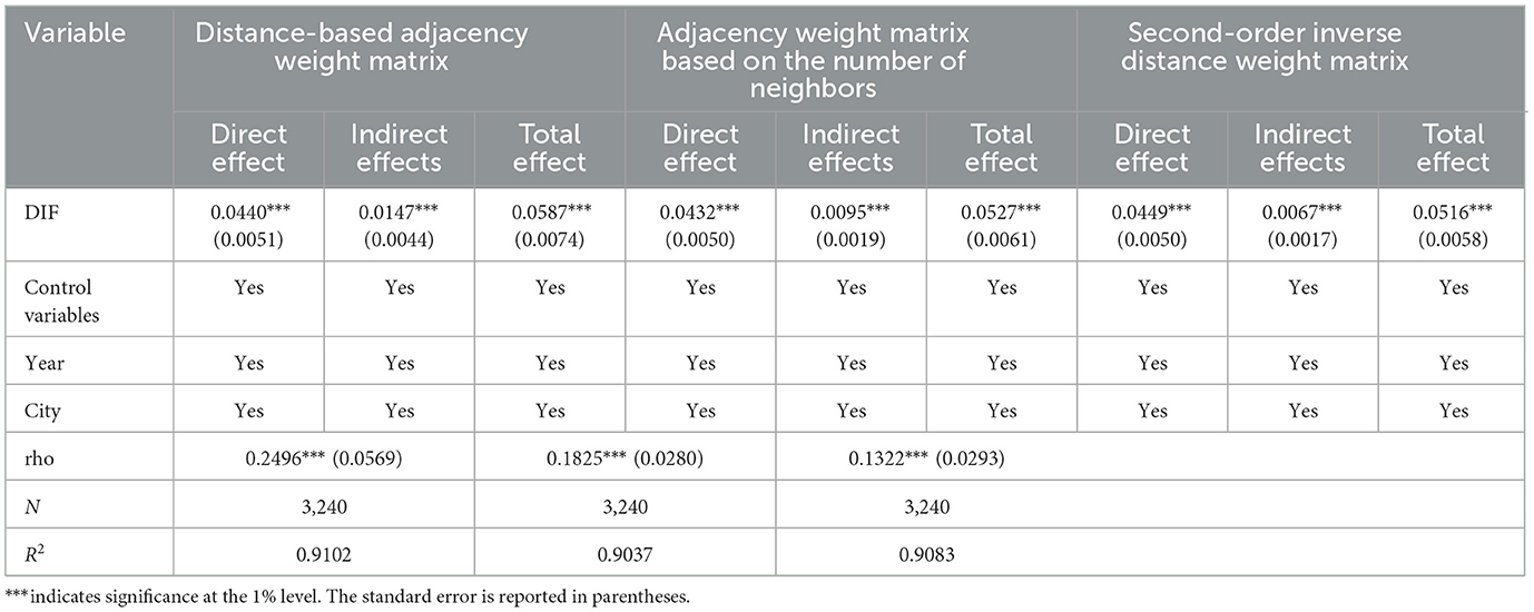 In this article, the lagrange multiplier (LM) test is used to clarify the type of spatial econometric model to be adopted. Table 11 shows that the spatial lag and spatial error of the distance-based adjacency weight matrix and the second-order inverse distance weight matrix significantly reject the null hypothesis at the level of 1%, while the spatial lag and spatial error of the adjacency weight matrix based on the number of adjacents significantly reject the null hypothesis at the level of 10% and 1%, respectively, indicating that the spatial lag model, spatial error model and spatial Durbin model can all be adopted. In order to visually present the spatial spillover effect of DIF on AR and to take into account the simplicity and interpretability of the model, this study decided to use the spatial lag model for spatial econometric analysis.
