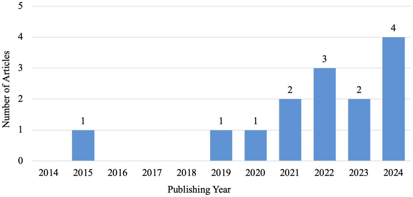 The selected 14 articles were published between 2014 and 2024 (see Figure 4). This study restricted the search years to 2014–2024, but almost no articles on China’s organic food consumption were found in Web of Science and Scopus before 2019. The only article that met the requirements was a study on the determinants driving organic food consumption published by Teng and Wang (2015). This suggests that organic food consumption in China may not have been a topic of research interest before 2019. The initial organic product was introduced for export in 1990 (Xie et al., 2013). Subsequently, the Chinese organic food certification system evolved progressively. Furthermore, the Ministry of Agriculture was reluctant to endorse organic agriculture in the first years due to the need to feed a substantial population and the scarcity of arable land in China (Asli et al., 2017).