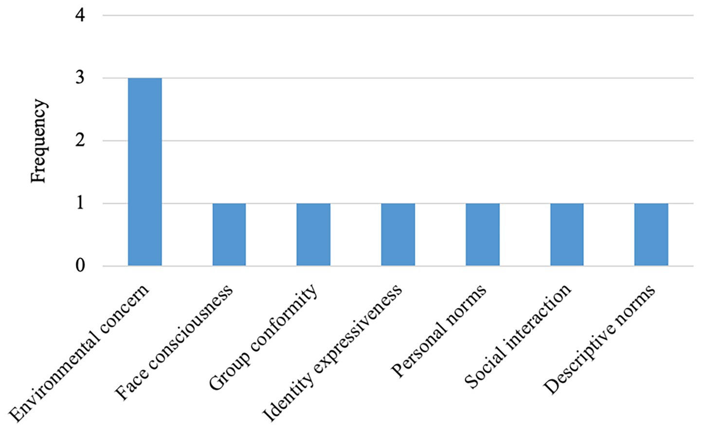 Social value is generally defined as the perceived ability of a product to confer a desirable social status upon the buyer, often in alignment with specific reference groups and their associated characteristics or preferences (Sheth et al., 1991). In the context of organic food consumption, social value encompasses consumers’ self-image and utilitarian motives, such as recommendations from others, social approval, reputation concerns, and self-identity (Puska et al., 2018; Mohd Suki et al., 2022). It may also extend to broader societal and environmental considerations, including environmental concern, support for local farmers, regional supply chains, and animal welfare (Saleki et al., 2019; Ditlevsen et al., 2020; Le-Anh and Nguyen-To, 2020). A systematic review of 14 relevant studies revealed that 7 examined social values as drivers of organic food consumption. Within these, environmental concern emerged as the most frequently analyzed factor (n = 3), followed by face consciousness (n = 1), group conformity (n = 1), identity expressiveness (n = 1), personal norms (n = 1), social interaction (n = 1), descriptive norms (n = 1) (see Figure 5). These findings underscore that, while social value can manifest through a variety of attributes, environmental concern remains the most salient motivator in the literature reviewed.