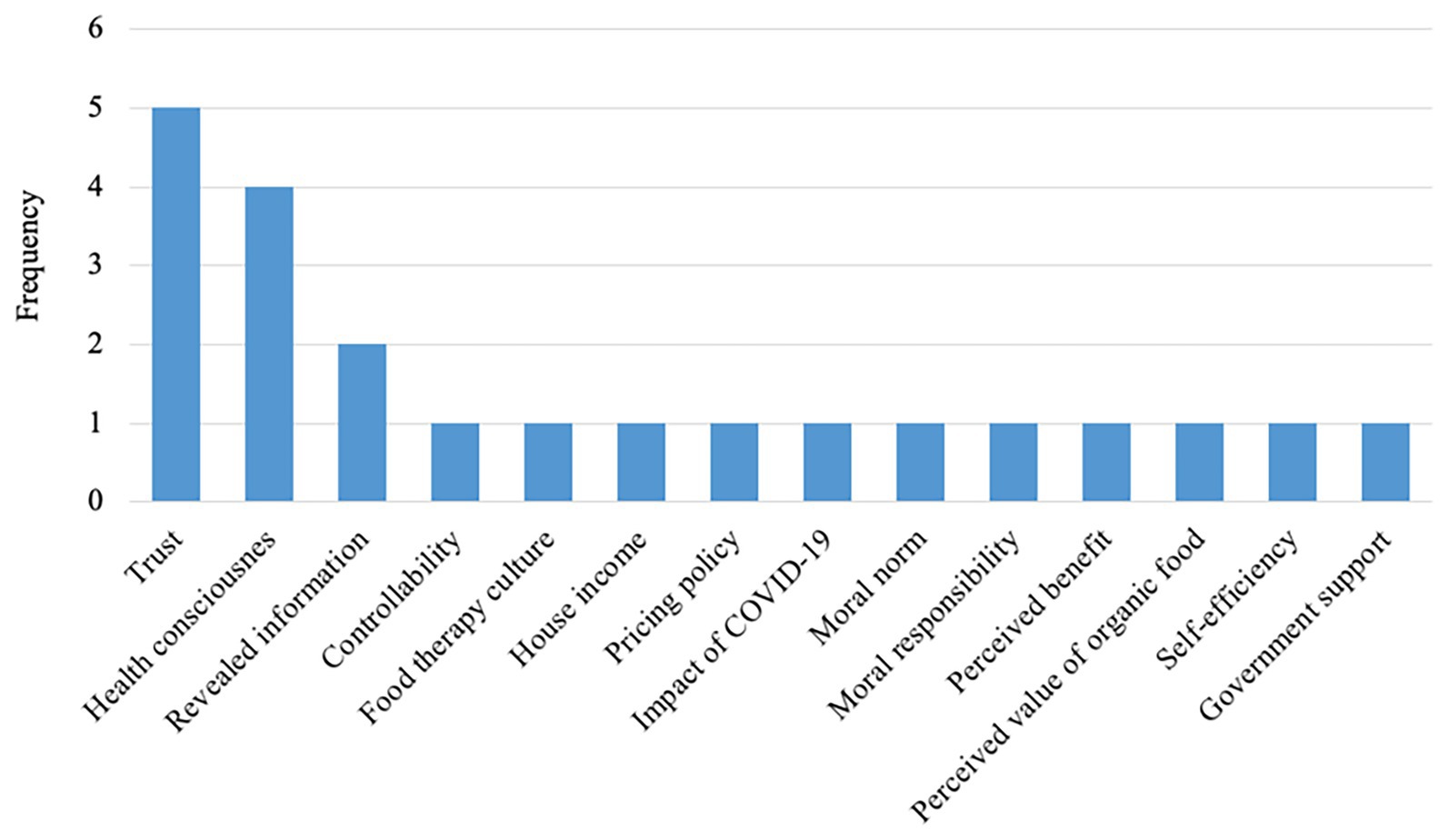 A systematic search and review of the literature on organic food purchasing behavior in China using the Theory of Planned Behavior revealed 14 eligible empirical studies. Ten of these studies incorporated conditional value variables into their research frameworks and validated their role as a key driver of organic food consumption in China. The many influential variables are arranged based on the frequency of their appearance in the analyzed literature (Figure 6). Among the effective factors identified, the most frequently examined were trust (n = 5), followed by health consciousness/awareness (n = 4), and revealed information (n = 2).