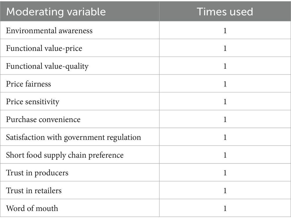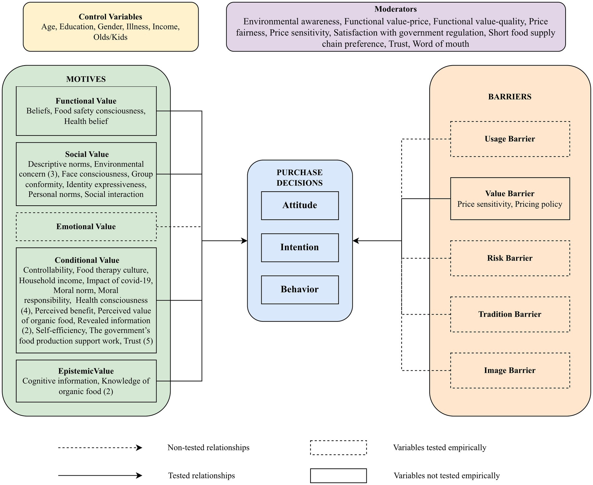 The review in this article shows that in the association between motivation, barriers, and organic food purchasing behavior, some researchers have introduced moderator variables in the Theory of Planned Behavior model to construct research models. Among the 14 studies reviewed in this article, seven studies introduced moderator variables (see Table 7). Xing and Liao (2024) explained that the functional value quality was a significant moderator that enhanced the indirect effect of motivation on organic food purchasing behavior, while the direct relationships between motivations and organic food purchasing behavior were not moderated by functional value price. Liu et al. (2024) found the influence of consumption intention on purchase frequency and purchase proportion is significantly moderated by price fairness, while purchase convenience has no significant moderating effect on the relationship between consumption intention and purchase frequency. Additionally, Huo et al. (2023) show that consumers’ short food supply chain preference positively moderate the relationship between purchase intention and purchase behavior Further, Chai et al. (2022) explained the moderating effect of sales guarantee regulation on the transformation from consumption willingness to behavior, and government’s food production support regulation was found to strengthen the relationship between food safety concerns and attitude to organic food consumption willingness. Ahmed et al. (2021) found that the relationship between all latent variables (attitude, subjective norms, and perceived behavior control) and purchase intention by young consumers is positively moderated by environmental awareness. In a study on organic food purchasing behavior of Chinese college students, word of mouth had a positive moderating impact on the relationship between health consciousness and purchasing behavior, and was found to strengthen the negative relationship between pricing policy and organic food purchasing behavior (Teng and Wang, 2015). Besides these, Xing et al. (2022) found that price sensitivity acts as a negative moderator on the relationships between perceived behavioral control and consumers’ organic food purchasing behavior (OFP), as well as purchase intention and OFP, while the moderating effect of price sensitivity on the relationship between personal norms and OFP has not been established.