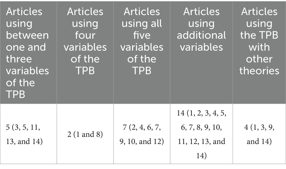 It is noteworthy that researchers in all 14 studies used the extended TPB model, with 4 of them integrating TPB with other theories, namely, 1, 3, 9, and 14. These theories include the Theory of Consumer Values (TCV), the Health Belief Model (HBM), the norm activation model (NAM), and the Consumer Decision Model. In these 14 studies, researchers included secondary structures into the original TPB model or developed theoretical frameworks encompassing 1–4 original TPB variables (see Table 3). Very often, these frameworks were referred to as “extended models,” although they did not include all the original TPB’s five constructs. This issue could be the subject of future discussions about whether we can refer to a model as an “extended Theory of Planned Behavior model” while using only one or two variables from the original TPB alongside external/additional constructs. The same discussion could apply to other multilevel theories. Based on this, Table 3 systematically lists the model structure of each study, clearly identifying which core TPB constructs were retained, which extended variables were introduced, and whether they were integrated with other theories.